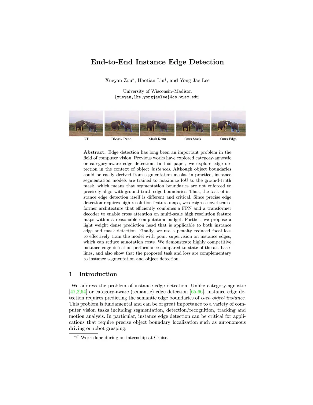 Edge detection has long been an important problem in the field of computer vision. Previous works have explored category-agnostic or category-aware edge detection. In this paper, we explore edge detection in the context of object instances. Although object boundaries could be easily derived from segmentation masks, in practice, instance segmentation models are trained to maximize IoU to the ground-truth mask, which means that segmentation boundaries are not enforced to precisely align with ground-truth edge boundaries. Thus, the task of instance edge detection itself is different and critical. Since precise edge detection requires high resolution feature maps, we design a novel transformer architecture that efficiently combines a FPN and a transformer decoder to enable cross attention on multi-scale high resolution feature maps within a reasonable computation budget. Further, we propose a light weight dense prediction head that is applicable to both instance edge and mask detection. Finally, we use a penalty reduced focal loss to effectively train the model with point supervision on instance edges, which can reduce annotation costs. We demonstrate highly competitive instance edge detection performance compared to state-of-the-art baselines, and also show that the proposed task and loss are complementary to instance segmentation and object detection.