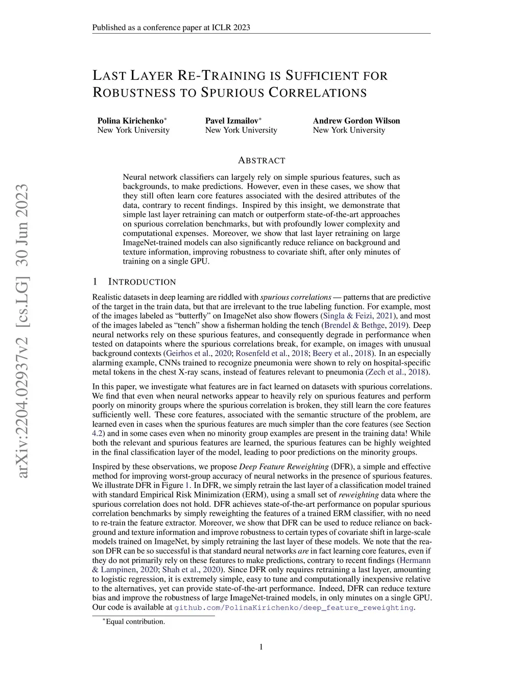 Neural network classifiers can largely rely on simple spurious features, such as backgrounds, to make predictions. However, even in these cases, we show that they still often learn core features associated with the desired attributes of the data, contrary to recent findings. Inspired by this insight, we demonstrate that simple last layer retraining can match or outperform state-of-the-art approaches on spurious correlation benchmarks, but with profoundly lower complexity and computational expenses. Moreover, we show that last layer retraining on large ImageNet-trained models can also significantly reduce reliance on background and texture information, improving robustness to covariate shift, after only minutes of training on a single GPU.
