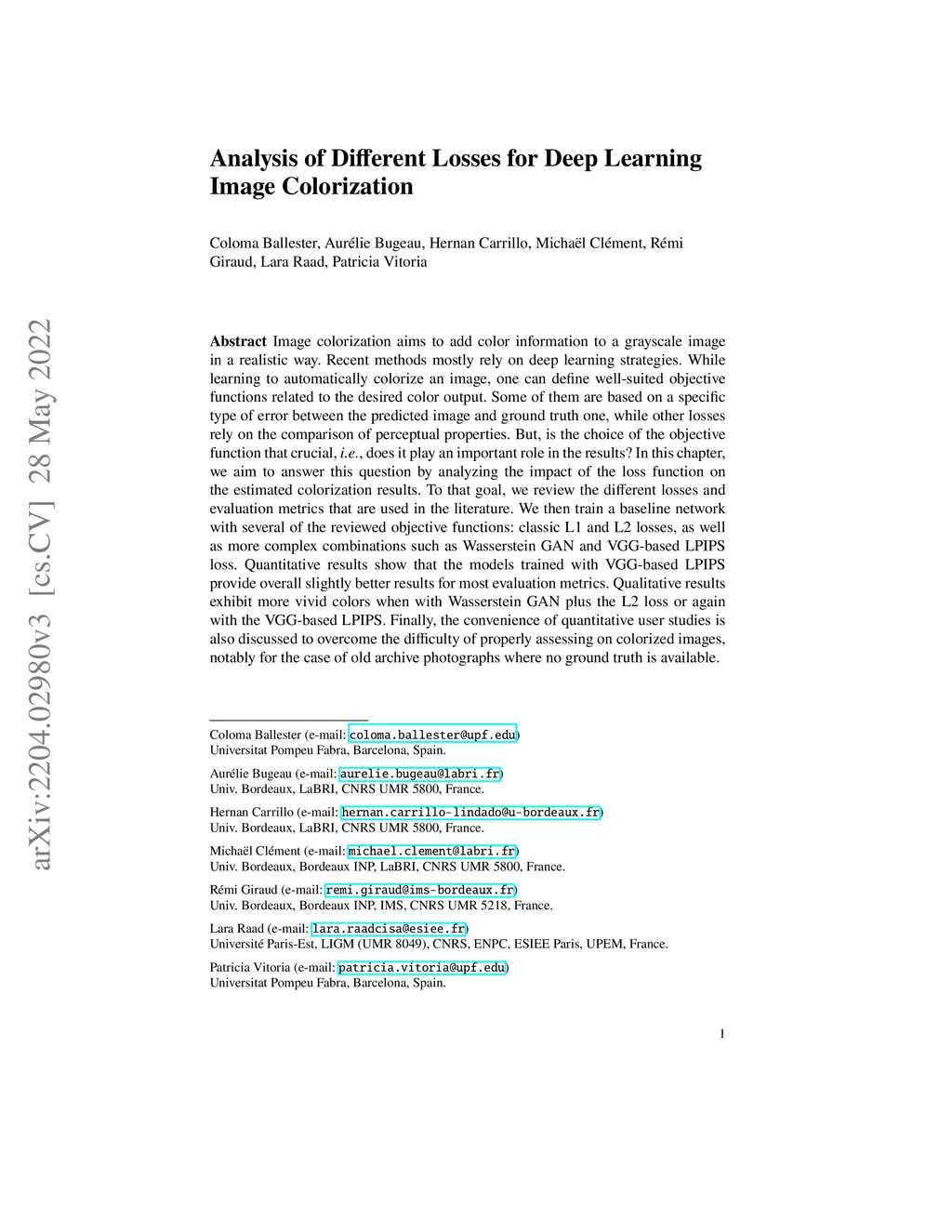 Image colorization aims to add color information to a grayscale image in a realistic way. Recent methods mostly rely on deep learning strategies. While learning to automatically colorize an image, one can define well-suited objective functions related to the desired color output. Some of them are based on a specific type of error between the predicted image and ground truth one, while other losses rely on the comparison of perceptual properties. But, is the choice of the objective function that crucial, i.e., does it play an important role in the results? In this chapter, we aim to answer this question by analyzing the impact of the loss function on the estimated colorization results. To that goal, we review the different losses and evaluation metrics that are used in the literature. We then train a baseline network with several of the reviewed objective functions: classic L1 and L2 losses, as well as more complex combinations such as Wasserstein GAN and VGG-based LPIPS loss. Quantitative results show that the models trained with VGG-based LPIPS provide overall slightly better results for most evaluation metrics. Qualitative results exhibit more vivid colors when with Wasserstein GAN plus the L2 loss or again with the VGG-based LPIPS. Finally, the convenience of quantitative user studies is also discussed to overcome the difficulty of properly assessing on colorized images, notably for the case of old archive photographs where no ground truth is available.