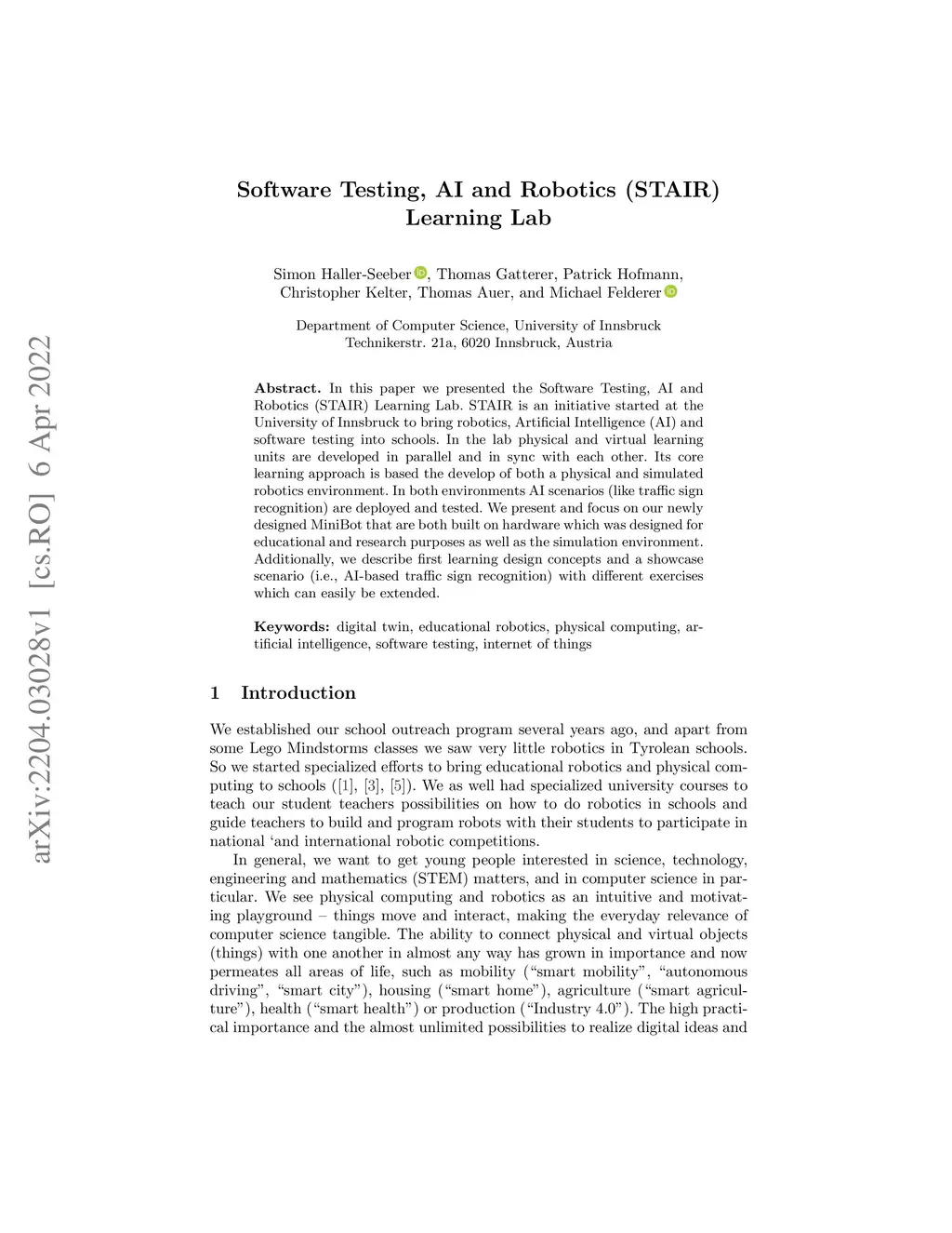 In this paper we presented the Software Testing, AI and Robotics (STAIR) Learning Lab. STAIR is an initiative started at the University of Innsbruck to bring robotics, Artificial Intelligence (AI) and software testing into schools. In the lab physical and virtual learning units are developed in parallel and in sync with each other. Its core learning approach is based the develop of both a physical and simulated robotics environment. In both environments AI scenarios (like traffic sign recognition) are deployed and tested. We present and focus on our newly designed MiniBot that are both built on hardware which was designed for educational and research purposes as well as the simulation environment. Additionally, we describe first learning design concepts and a showcase scenario (i.e., AI-based traffic sign recognition) with different exercises which can easily be extended.