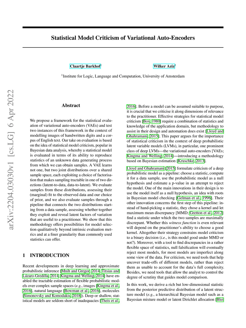 We propose a framework for the statistical evaluation of variational auto-encoders (VAEs) and test two instances of this framework in the context of modelling images of handwritten digits and a corpus of English text. Our take on evaluation is based on the idea of statistical model criticism, popular in Bayesian data analysis, whereby a statistical model is evaluated in terms of its ability to reproduce statistics of an unknown data generating process from which we can obtain samples. A VAE learns not one, but two joint distributions over a shared sample space, each exploiting a choice of factorisation that makes sampling tractable in one of two directions (latent-to-data, data-to-latent). We evaluate samples from these distributions, assessing their (marginal) fit to the observed data and our choice of prior, and we also evaluate samples through a pipeline that connects the two distributions starting from a data sample, assessing whether together they exploit and reveal latent factors of variation that are useful to a practitioner. We show that this methodology offers possibilities for model selection qualitatively beyond intrinsic evaluation metrics and at a finer granularity than commonly used statistics can offer.