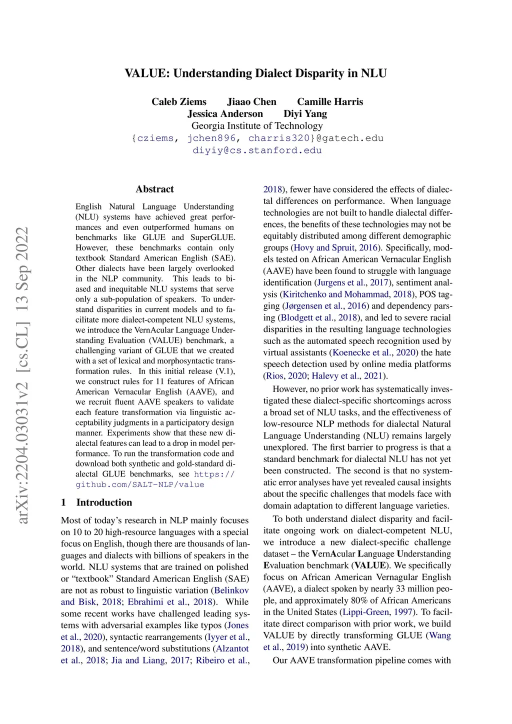 English Natural Language Understanding (NLU) systems have achieved great performances and even outperformed humans on benchmarks like GLUE and SuperGLUE. However, these benchmarks contain only textbook Standard American English (SAE). Other dialects have been largely overlooked in the NLP community. This leads to biased and inequitable NLU systems that serve only a sub-population of speakers. To understand disparities in current models and to facilitate more dialect-competent NLU systems, we introduce the VernAcular Language Understanding Evaluation (VALUE) benchmark, a challenging variant of GLUE that we created with a set of lexical and morphosyntactic transformation rules. In this initial release (V.1), we construct rules for 11 features of African American Vernacular English (AAVE), and we recruit fluent AAVE speakers to validate each feature transformation via linguistic acceptability judgments in a participatory design manner. Experiments show that these new dialectal features can lead to a drop in model performance. To run the transformation code and download both synthetic and gold-standard dialectal GLUE benchmarks, see https://github.com/SALT-NLP/value