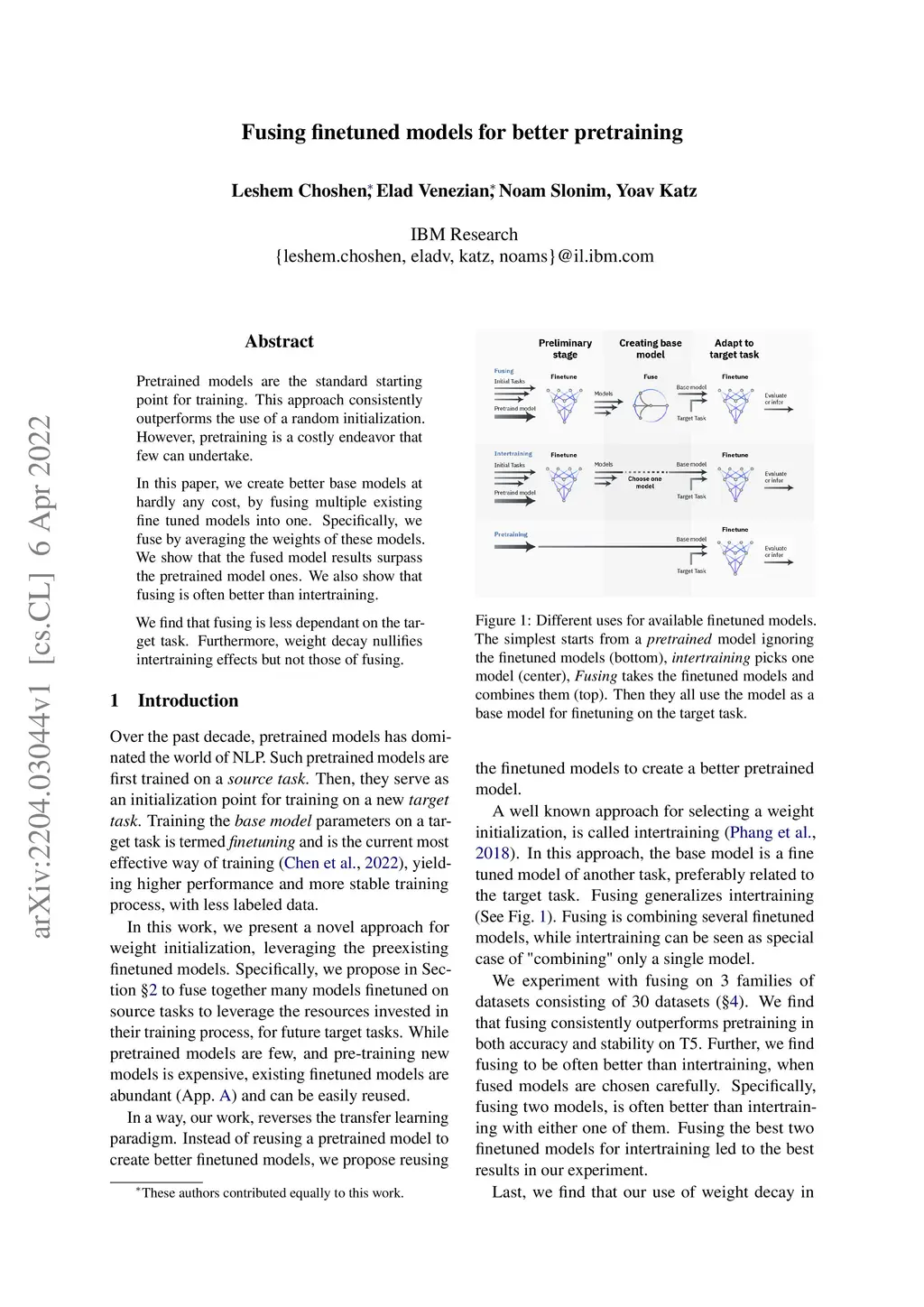 Pretrained models are the standard starting point for training. This approach consistently outperforms the use of a random initialization. However, pretraining is a costly endeavour that few can undertake. In this paper, we create better base models at hardly any cost, by fusing multiple existing fine tuned models into one. Specifically, we fuse by averaging the weights of these models. We show that the fused model results surpass the pretrained model ones. We also show that fusing is often better than intertraining. We find that fusing is less dependent on the target task. Furthermore, weight decay nullifies intertraining effects but not those of fusing.