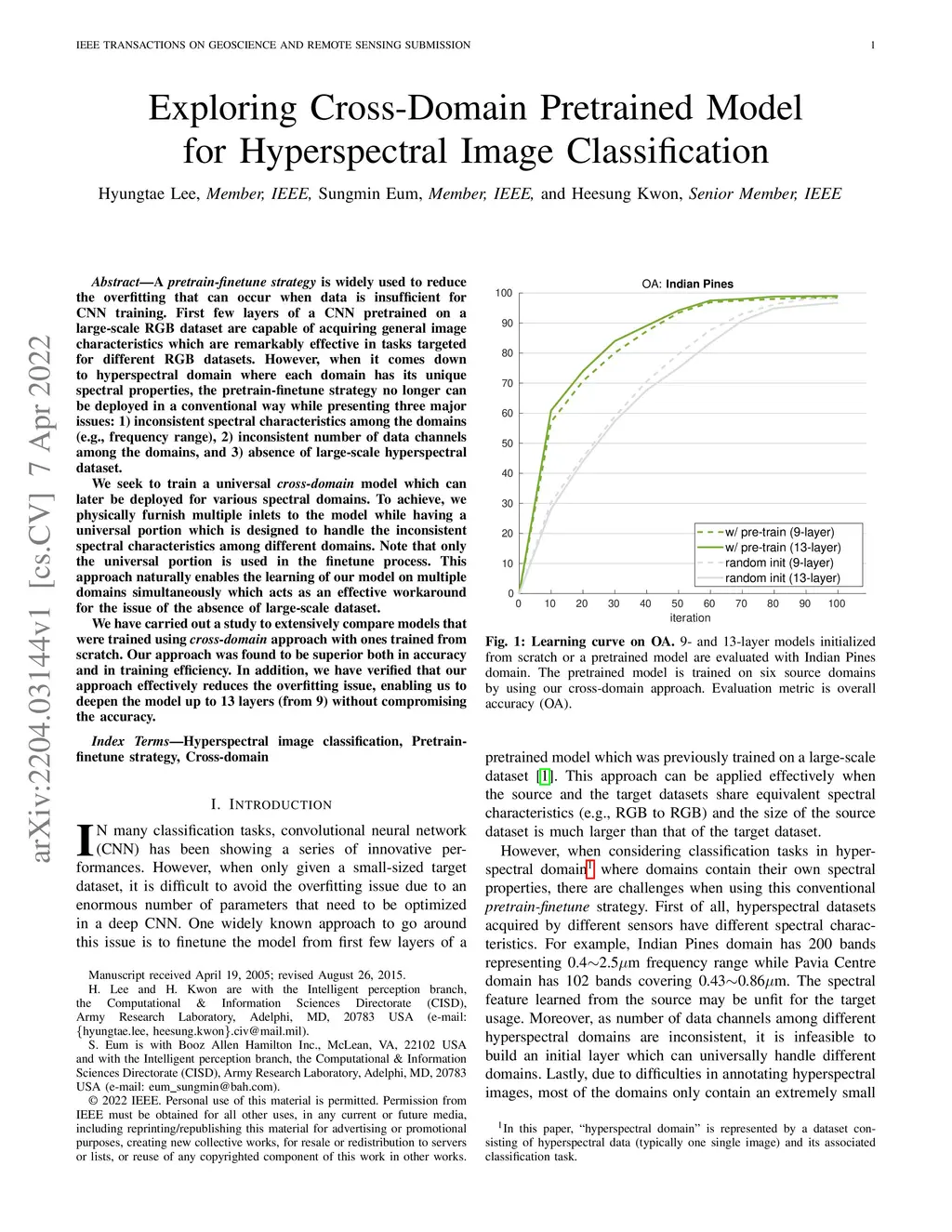 A pretrain-finetune strategy is widely used to reduce the overfitting that can occur when data is insufficient for CNN training. First few layers of a CNN pretrained on a large-scale RGB dataset are capable of acquiring general image characteristics which are remarkably effective in tasks targeted for different RGB datasets. However, when it comes down to hyperspectral domain where each domain has its unique spectral properties, the pretrain-finetune strategy no longer can be deployed in a conventional way while presenting three major issues: 1) inconsistent spectral characteristics among the domains (e.g., frequency range), 2) inconsistent number of data channels among the domains, and 3) absence of large-scale hyperspectral dataset. We seek to train a universal cross-domain model which can later be deployed for various spectral domains. To achieve, we physically furnish multiple inlets to the model while having a universal portion which is designed to handle the inconsistent spectral characteristics among different domains. Note that only the universal portion is used in the finetune process. This approach naturally enables the learning of our model on multiple domains simultaneously which acts as an effective workaround for the issue of the absence of large-scale dataset. We have carried out a study to extensively compare models that were trained using cross-domain approach with ones trained from scratch. Our approach was found to be superior both in accuracy and in training efficiency. In addition, we have verified that our approach effectively reduces the overfitting issue, enabling us to deepen the model up to 13 layers (from 9) without compromising the accuracy.