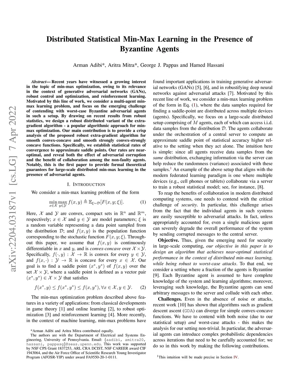 Recent years have witnessed a growing interest in the topic of min-max optimization, owing to its relevance in the context of generative adversarial networks (GANs), robust control and optimization, and reinforcement learning. Motivated by this line of work, we consider a multi-agent min-max learning problem, and focus on the emerging challenge of contending with worst-case Byzantine adversarial agents in such a setup. By drawing on recent results from robust statistics, we design a robust distributed variant of the extra-gradient algorithm - a popular algorithmic approach for min-max optimization. Our main contribution is to provide a crisp analysis of the proposed robust extra-gradient algorithm for smooth convex-concave and smooth strongly convex-strongly concave functions. Specifically, we establish statistical rates of convergence to approximate saddle points. Our rates are near-optimal, and reveal both the effect of adversarial corruption and the benefit of collaboration among the non-faulty agents. Notably, this is the first paper to provide formal theoretical guarantees for large-scale distributed min-max learning in the presence of adversarial agents.