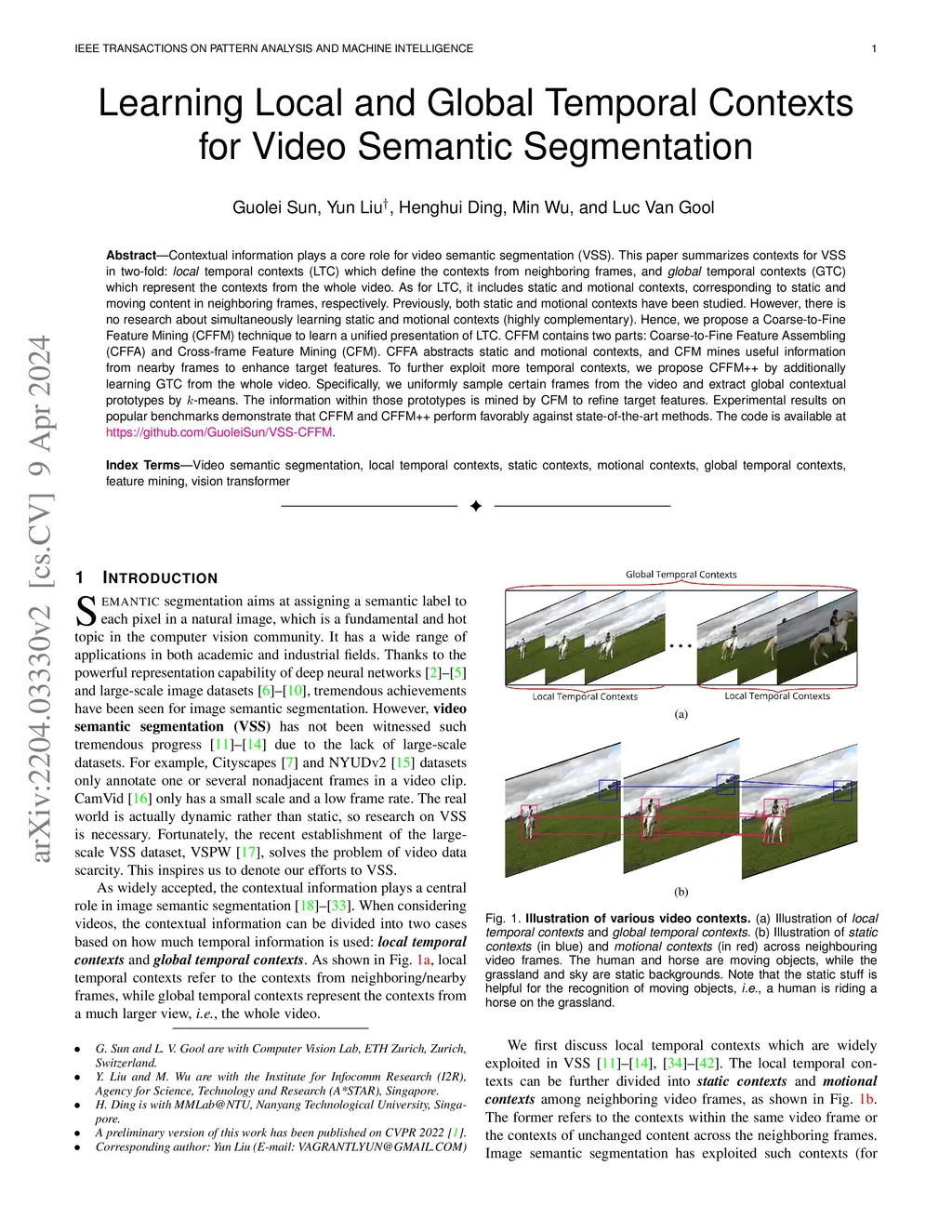 Contextual information plays a core role for video semantic segmentation (VSS). This paper summarizes contexts for VSS in two-fold: local temporal contexts (LTC) which define the contexts from neighboring frames, and global temporal contexts (GTC) which represent the contexts from the whole video. As for LTC, it includes static and motional contexts, corresponding to static and moving content in neighboring frames, respectively. Previously, both static and motional contexts have been studied. However, there is no research about simultaneously learning static and motional contexts (highly complementary). Hence, we propose a Coarse-to-Fine Feature Mining (CFFM) technique to learn a unified presentation of LTC. CFFM contains two parts: Coarse-to-Fine Feature Assembling (CFFA) and Cross-frame Feature Mining (CFM). CFFA abstracts static and motional contexts, and CFM mines useful information from nearby frames to enhance target features. To further exploit more temporal contexts, we propose CFFM++ by additionally learning GTC from the whole video. Specifically, we uniformly sample certain frames from the video and extract global contextual prototypes by k-means. The information within those prototypes is mined by CFM to refine target features. Experimental results on popular benchmarks demonstrate that CFFM and CFFM++ perform favorably against state-of-the-art methods. Our code is available at https://github.com/GuoleiSun/VSS-CFFM