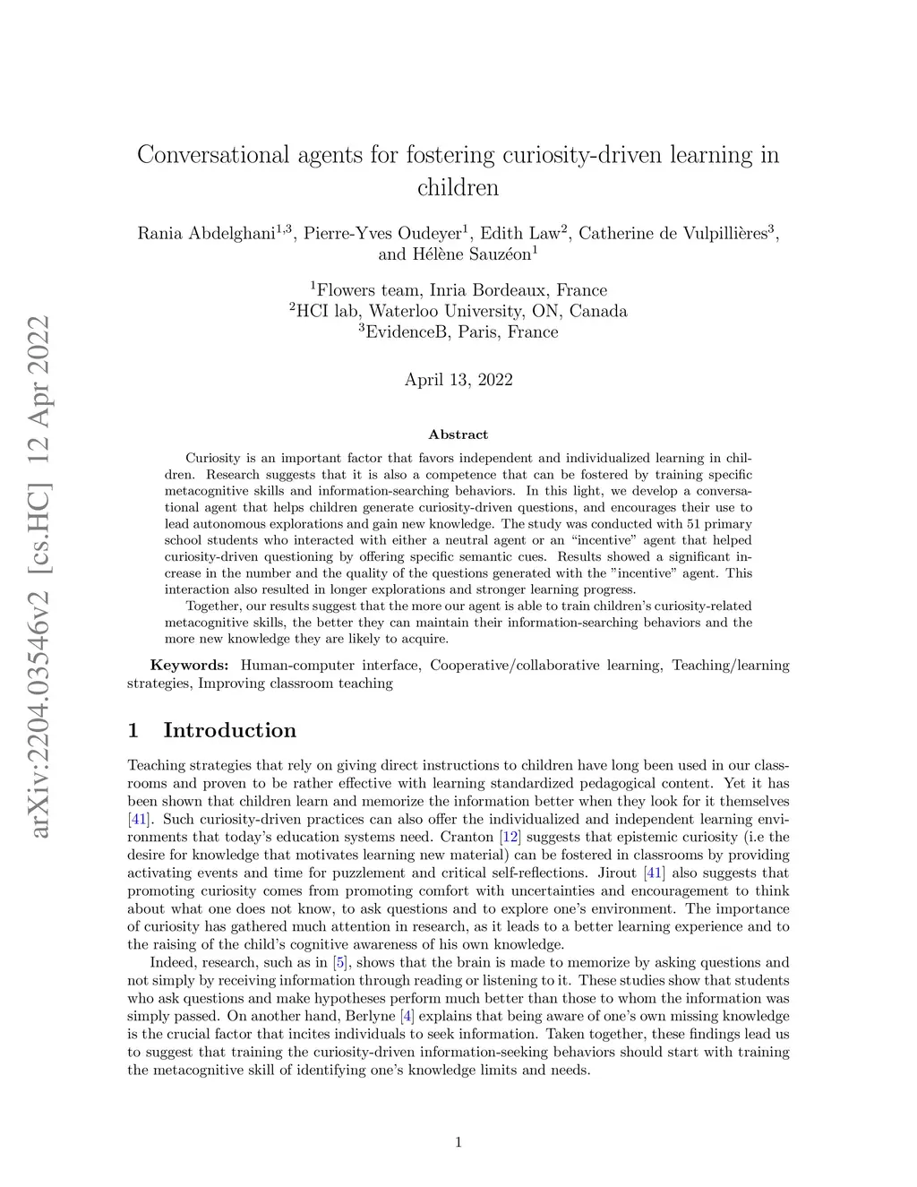 Curiosity is an important factor that favors independent and individualized learning in children. Research suggests that it is also a competence that can be fostered by training specific metacognitive skills and information-searching behaviors. In this light, we develop a conversational agent that helps children generate curiosity-driven questions, and encourages their use to lead autonomous explorations and gain new knowledge. The study was conducted with 51 primary school students who interacted with either a neutral agent or an incentive agent that helped curiosity-driven questioning by offering specific semantic cues. Results showed a significant increase in the number and the quality of the questions generated with the incentive agent. This interaction also resulted in longer explorations and stronger learning progress. Together, our results suggest that the more our agent is able to train children's curiosity-related metacognitive skills, the better they can maintain their information-searching behaviors and the more new knowledge they are likely to acquire.