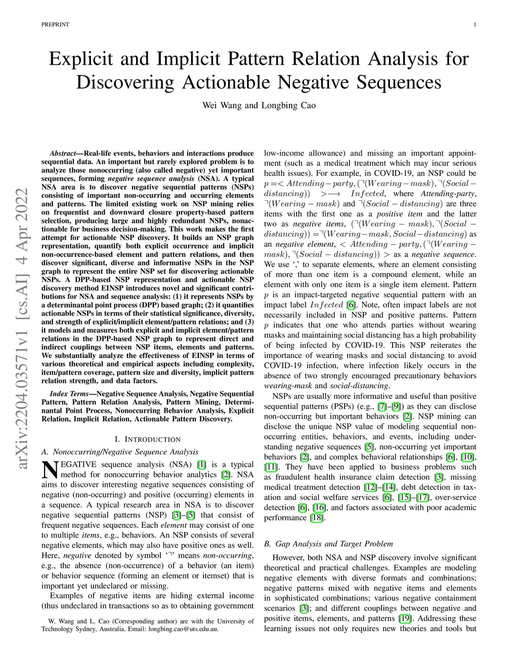 Real-life events, behaviors and interactions produce sequential data. An important but rarely explored problem is to analyze those nonoccurring (also called negative) yet important sequences, forming negative sequence analysis (NSA). A typical NSA area is to discover negative sequential patterns (NSPs) consisting of important non-occurring and occurring elements and patterns. The limited existing work on NSP mining relies on frequentist and downward closure property-based pattern selection, producing large and highly redundant NSPs, nonactionable for business decision-making. This work makes the first attempt for actionable NSP discovery. It builds an NSP graph representation, quantify both explicit occurrence and implicit non-occurrence-based element and pattern relations, and then discover significant, diverse and informative NSPs in the NSP graph to represent the entire NSP set for discovering actionable NSPs. A DPP-based NSP representation and actionable NSP discovery method EINSP introduces novel and significant contributions for NSA and sequence analysis: (1) it represents NSPs by a determinantal point process (DPP) based graph; (2) it quantifies actionable NSPs in terms of their statistical significance, diversity, and strength of explicit/implicit element/pattern relations; and (3) it models and measures both explicit and implicit element/pattern relations in the DPP-based NSP graph to represent direct and indirect couplings between NSP items, elements and patterns. We substantially analyze the effectiveness of EINSP in terms of various theoretical and empirical aspects including complexity, item/pattern coverage, pattern size and diversity, implicit pattern relation strength, and data factors.