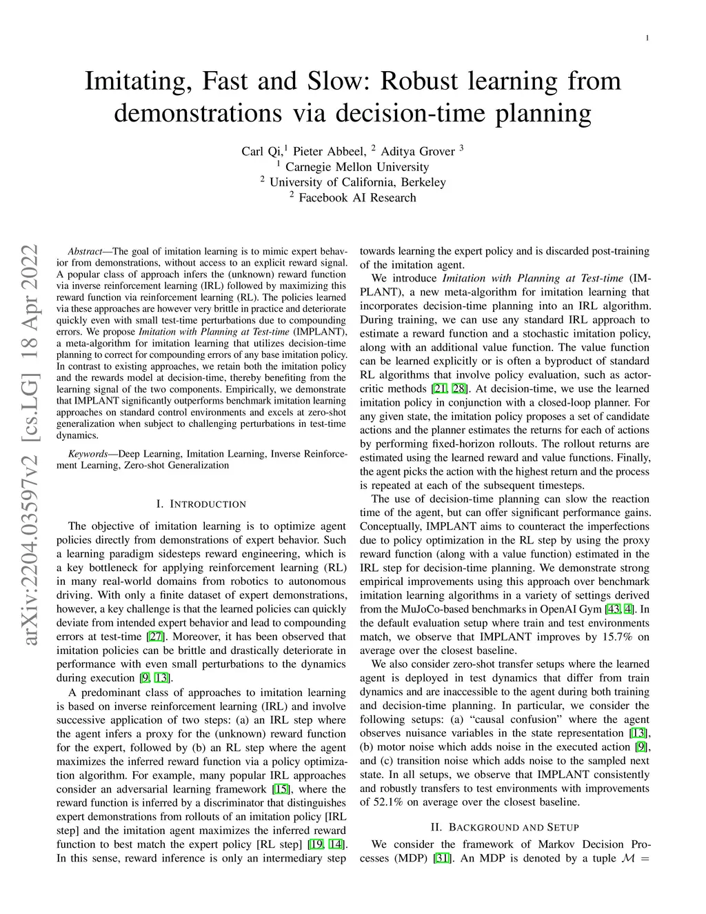 The goal of imitation learning is to mimic expert behavior from demonstrations, without access to an explicit reward signal. A popular class of approach infers the (unknown) reward function via inverse reinforcement learning (IRL) followed by maximizing this reward function via reinforcement learning (RL). The policies learned via these approaches are however very brittle in practice and deteriorate quickly even with small test-time perturbations due to compounding errors. We propose Imitation with Planning at Test-time (IMPLANT), a new meta-algorithm for imitation learning that utilizes decision-time planning to correct for compounding errors of any base imitation policy. In contrast to existing approaches, we retain both the imitation policy and the rewards model at decision-time, thereby benefiting from the learning signal of the two components. Empirically, we demonstrate that IMPLANT significantly outperforms benchmark imitation learning approaches on standard control environments and excels at zero-shot generalization when subject to challenging perturbations in test-time dynamics.