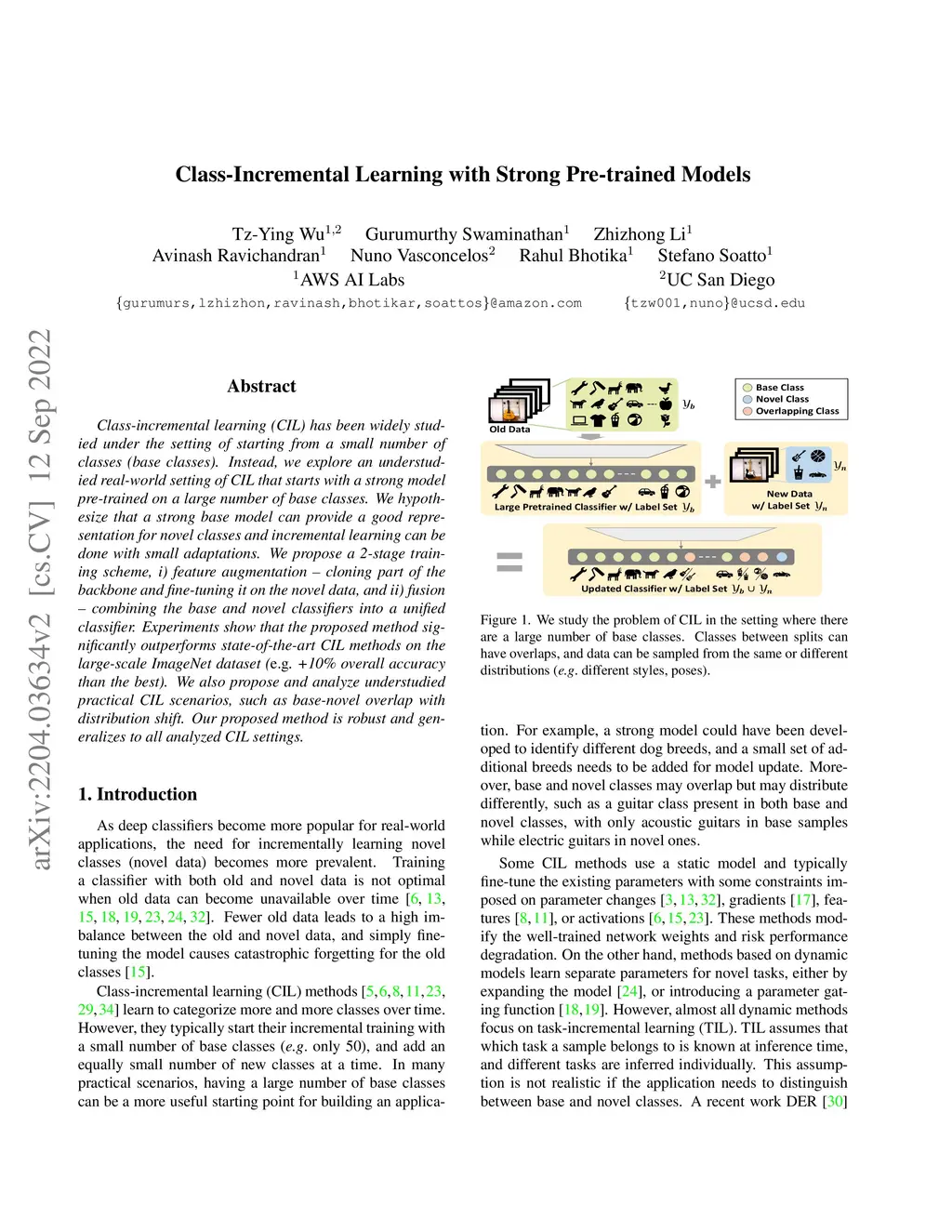 Class-incremental learning (CIL) has been widely studied under the setting of starting from a small number of classes (base classes). Instead, we explore an understudied real-world setting of CIL that starts with a strong model pre-trained on a large number of base classes. We hypothesize that a strong base model can provide a good representation for novel classes and incremental learning can be done with small adaptations. We propose a 2-stage training scheme, i) feature augmentation -- cloning part of the backbone and fine-tuning it on the novel data, and ii) fusion -- combining the base and novel classifiers into a unified classifier. Experiments show that the proposed method significantly outperforms state-of-the-art CIL methods on the large-scale ImageNet dataset (e.g. +10% overall accuracy than the best). We also propose and analyze understudied practical CIL scenarios, such as base-novel overlap with distribution shift. Our proposed method is robust and generalizes to all analyzed CIL settings. Code is available at https://github.com/amazon-research/sp-cil.