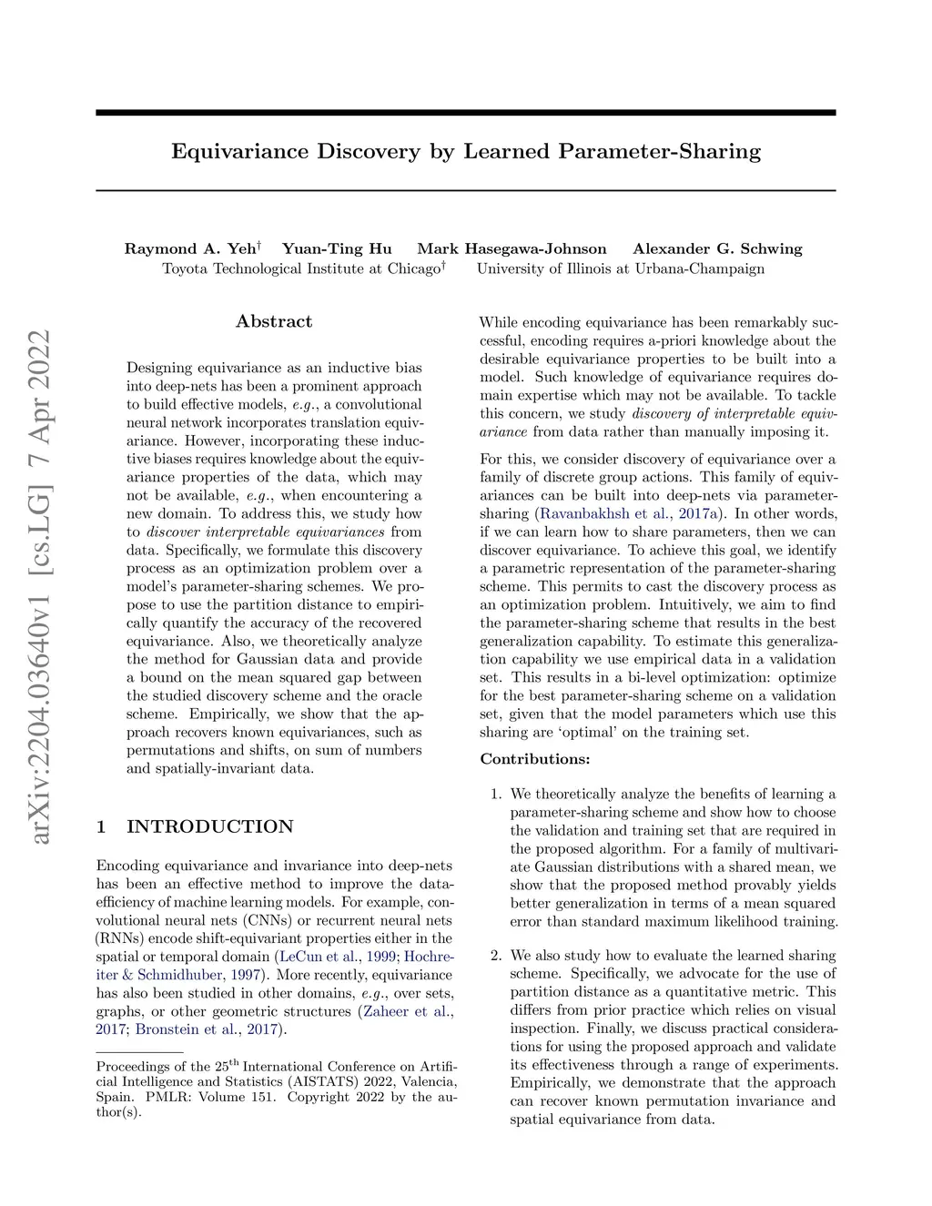 Designing equivariance as an inductive bias into deep-nets has been a prominent approach to build effective models, e.g., a convolutional neural network incorporates translation equivariance. However, incorporating these inductive biases requires knowledge about the equivariance properties of the data, which may not be available, e.g., when encountering a new domain. To address this, we study how to discover interpretable equivariances from data. Specifically, we formulate this discovery process as an optimization problem over a model's parameter-sharing schemes. We propose to use the partition distance to empirically quantify the accuracy of the recovered equivariance. Also, we theoretically analyze the method for Gaussian data and provide a bound on the mean squared gap between the studied discovery scheme and the oracle scheme. Empirically, we show that the approach recovers known equivariances, such as permutations and shifts, on sum of numbers and spatially-invariant data.