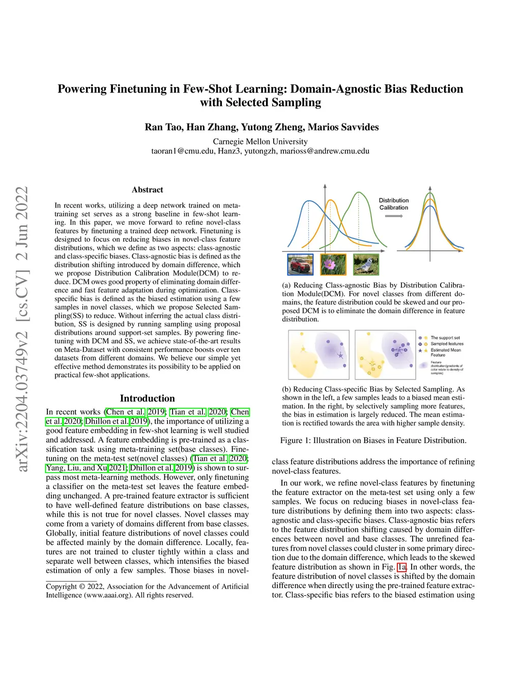 In recent works, utilizing a deep network trained on meta-training set serves as a strong baseline in few-shot learning. In this paper, we move forward to refine novel-class features by finetuning a trained deep network. Finetuning is designed to focus on reducing biases in novel-class feature distributions, which we define as two aspects: class-agnostic and class-specific biases. Class-agnostic bias is defined as the distribution shifting introduced by domain difference, which we propose Distribution Calibration Module(DCM) to reduce. DCM owes good property of eliminating domain difference and fast feature adaptation during optimization. Class-specific bias is defined as the biased estimation using a few samples in novel classes, which we propose Selected Sampling(SS) to reduce. Without inferring the actual class distribution, SS is designed by running sampling using proposal distributions around support-set samples. By powering finetuning with DCM and SS, we achieve state-of-the-art results on Meta-Dataset with consistent performance boosts over ten datasets from different domains. We believe our simple yet effective method demonstrates its possibility to be applied on practical few-shot applications.