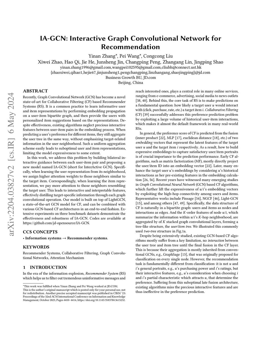 IA-GCN: Interactive Graph Convolutional Network for Recommendation