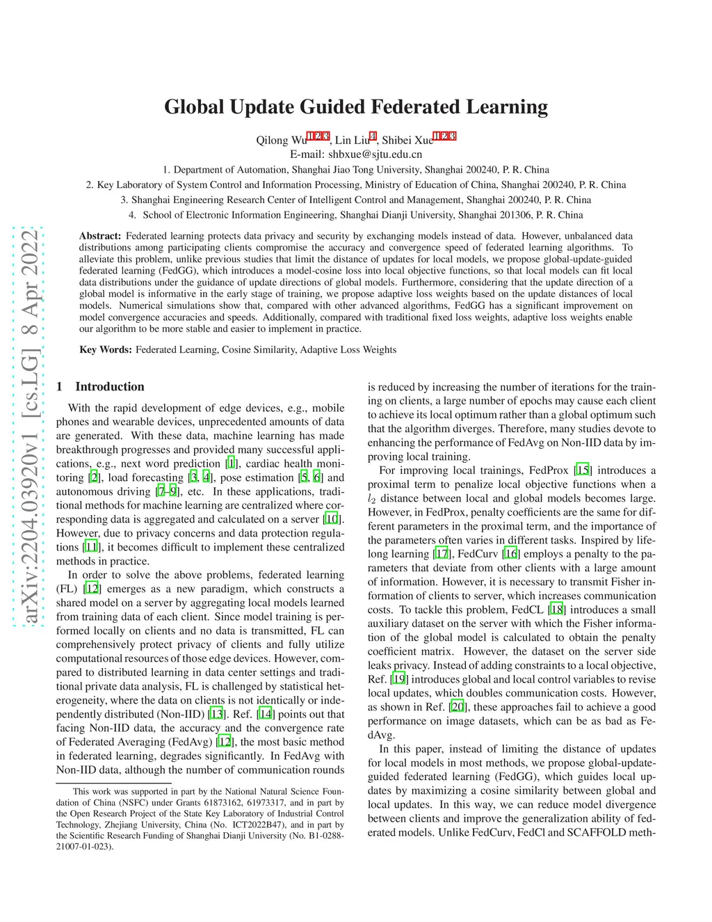 Federated learning protects data privacy and security by exchanging models instead of data. However, unbalanced data distributions among participating clients compromise the accuracy and convergence speed of federated learning algorithms. To alleviate this problem, unlike previous studies that limit the distance of updates for local models, we propose global-update-guided federated learning (FedGG), which introduces a model-cosine loss into local objective functions, so that local models can fit local data distributions under the guidance of update directions of global models. Furthermore, considering that the update direction of a global model is informative in the early stage of training, we propose adaptive loss weights based on the update distances of local models. Numerical simulations show that, compared with other advanced algorithms, FedGG has a significant improvement on model convergence accuracies and speeds. Additionally, compared with traditional fixed loss weights, adaptive loss weights enable our algorithm to be more stable and easier to implement in practice.