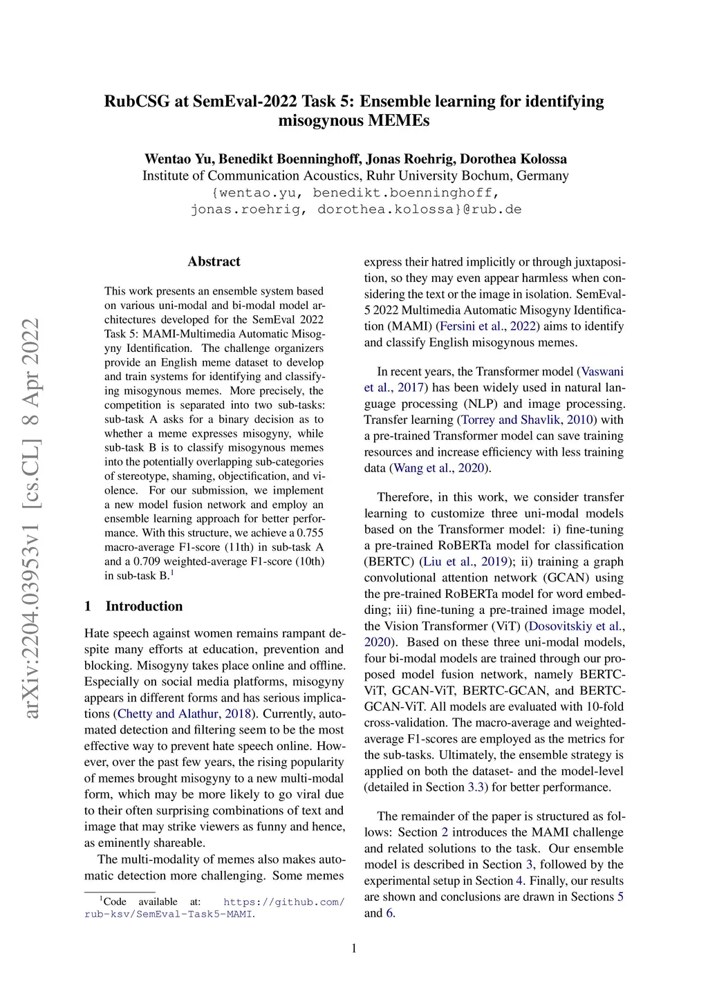 RubCSG at SemEval-2022 Task 5: Ensemble learning for identifying