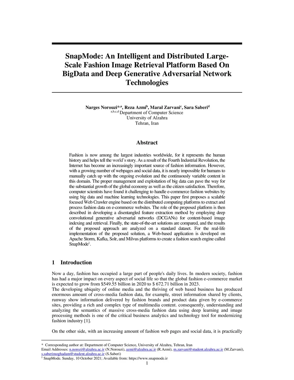 Fashion is now among the largest industries worldwide, for it represents human history and helps tell the worlds story. As a result of the Fourth Industrial Revolution, the Internet has become an increasingly important source of fashion information. However, with a growing number of web pages and social data, it is nearly impossible for humans to manually catch up with the ongoing evolution and the continuously variable content in this domain. The proper management and exploitation of big data can pave the way for the substantial growth of the global economy as well as citizen satisfaction. Therefore, computer scientists have found it challenging to handle e-commerce fashion websites by using big data and machine learning technologies. This paper first proposes a scalable focused Web Crawler engine based on the distributed computing platforms to extract and process fashion data on e-commerce websites. The role of the proposed platform is then described in developing a disentangled feature extraction method by employing deep convolutional generative adversarial networks (DCGANs) for content-based image indexing and retrieval. Finally, the state-of-the-art solutions are compared, and the results of the proposed approach are analyzed on a standard dataset. For the real-life implementation of the proposed solution, a Web-based application is developed on Apache Storm, Kafka, Solr, and Milvus platforms to create a fashion search engine called SnapMode.