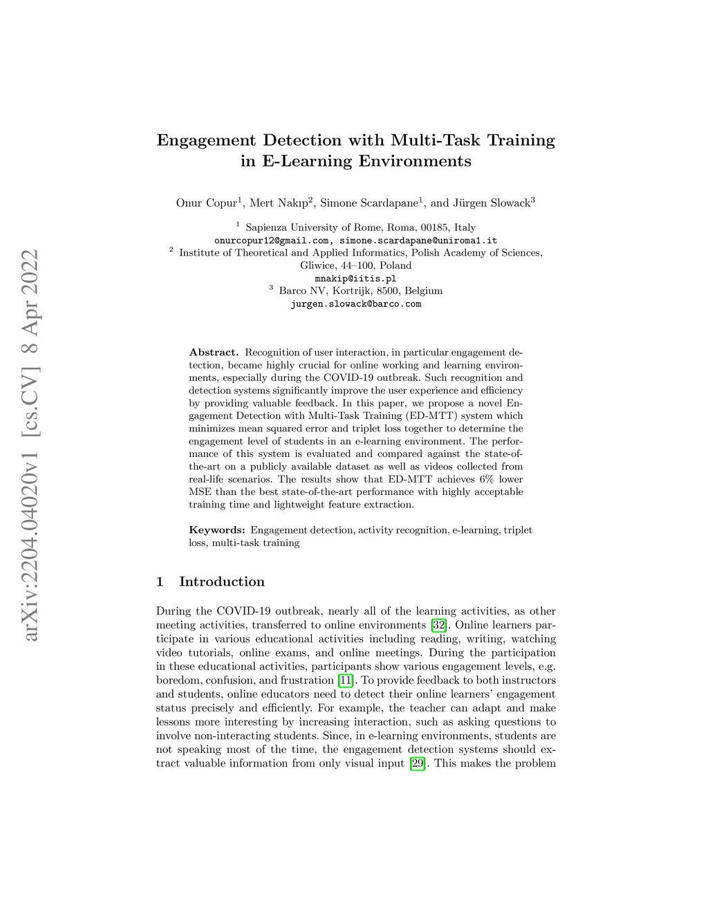 Engagement Detection with Multi-Task Training in E-Learning Environments