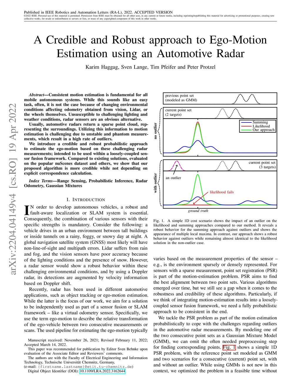 Consistent motion estimation is fundamental for all mobile autonomous systems. While this sounds like an easy task, often, it is not the case because of changing environmental conditions affecting odometry obtained from vision, Lidar, or the wheels themselves. Unsusceptible to challenging lighting and weather conditions, radar sensors are an obvious alternative. Usually, automotive radars return a sparse point cloud, representing the surroundings. Utilizing this information to motion estimation is challenging due to unstable and phantom measurements, which result in a high rate of outliers. We introduce a credible and robust probabilistic approach to estimate the ego-motion based on these challenging radar measurements; intended to be used within a loosely-coupled sensor fusion framework. Compared to existing solutions, evaluated on the popular nuScenes dataset and others, we show that our proposed algorithm is more credible while not depending on explicit correspondence calculation.