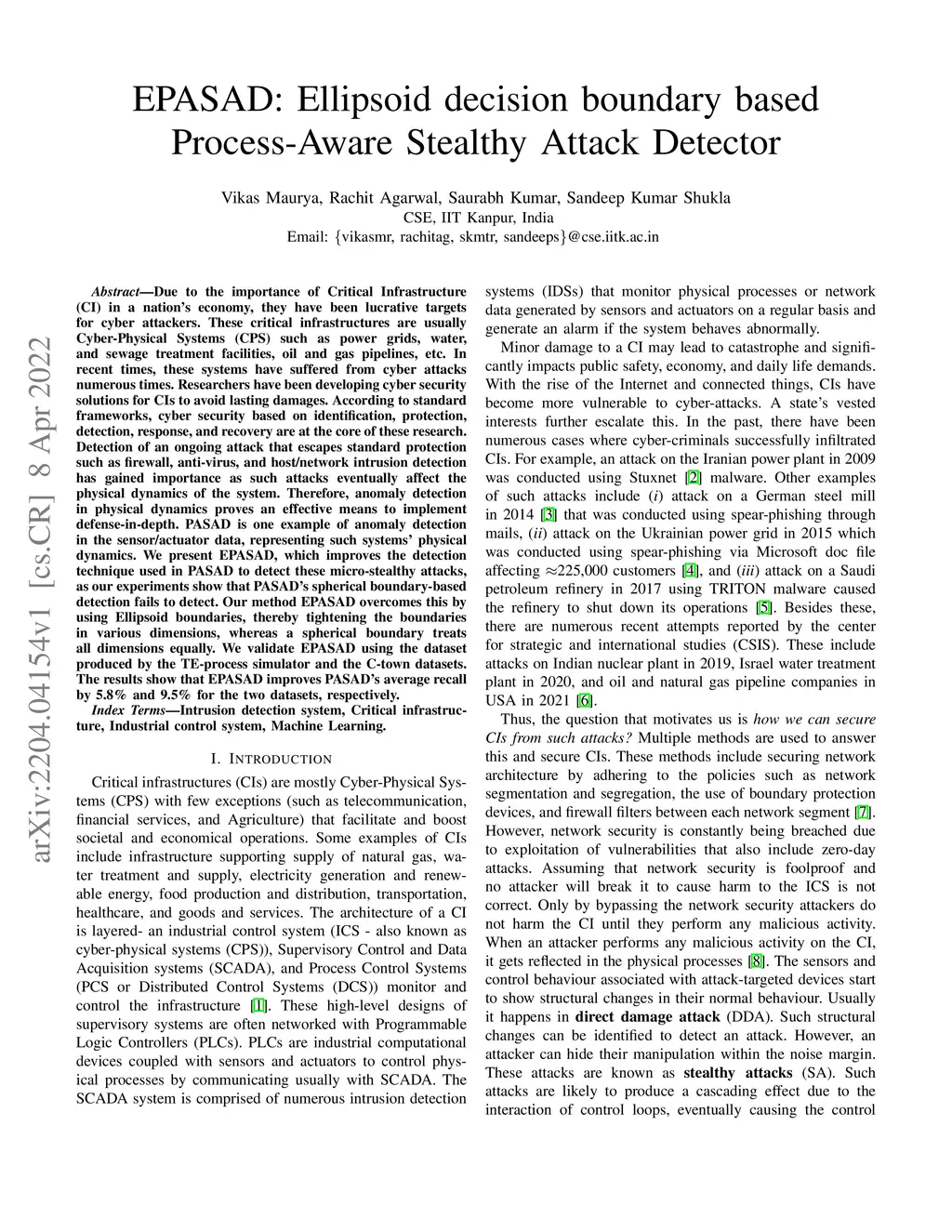 Due to the importance of Critical Infrastructure (CI) in a nation's economy, they have been lucrative targets for cyber attackers. These critical infrastructures are usually Cyber-Physical Systems (CPS) such as power grids, water, and sewage treatment facilities, oil and gas pipelines, etc. In recent times, these systems have suffered from cyber attacks numerous times. Researchers have been developing cyber security solutions for CIs to avoid lasting damages. According to standard frameworks, cyber security based on identification, protection, detection, response, and recovery are at the core of these research. Detection of an ongoing attack that escapes standard protection such as firewall, anti-virus, and host/network intrusion detection has gained importance as such attacks eventually affect the physical dynamics of the system. Therefore, anomaly detection in physical dynamics proves an effective means to implement defense-in-depth. PASAD is one example of anomaly detection in the sensor/actuator data, representing such systems' physical dynamics. We present EPASAD, which improves the detection technique used in PASAD to detect these micro-stealthy attacks, as our experiments show that PASAD's spherical boundary-based detection fails to detect. Our method EPASAD overcomes this by using Ellipsoid boundaries, thereby tightening the boundaries in various dimensions, whereas a spherical boundary treats all dimensions equally. We validate EPASAD using the dataset produced by the TE-process simulator and the C-town datasets. The results show that EPASAD improves PASAD's average recall by 5.8% and 9.5% for the two datasets, respectively.