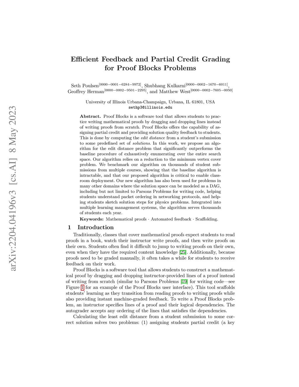 Proof Blocks is a software tool that allows students to practice writing mathematical proofs by dragging and dropping lines instead of writing proofs from scratch. Proof Blocks offers the capability of assigning partial credit and providing solution quality feedback to students. This is done by computing the edit distance from a student's submission to some predefined set of solutions. In this work, we propose an algorithm for the edit distance problem that significantly outperforms the baseline procedure of exhaustively enumerating over the entire search space. Our algorithm relies on a reduction to the minimum vertex cover problem. We benchmark our algorithm on thousands of student submissions from multiple courses, showing that the baseline algorithm is intractable, and that our proposed algorithm is critical to enable classroom deployment. Our new algorithm has also been used for problems in many other domains where the solution space can be modeled as a DAG, including but not limited to Parsons Problems for writing code, helping students understand packet ordering in networking protocols, and helping students sketch solution steps for physics problems. Integrated into multiple learning management systems, the algorithm serves thousands of students each year.