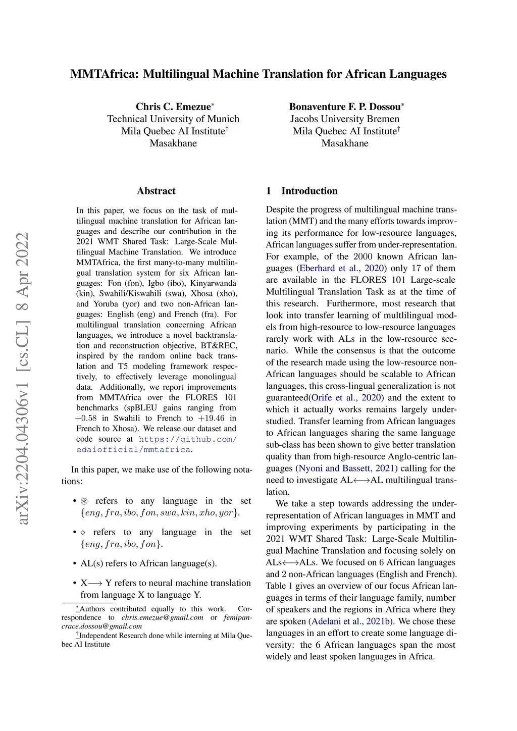 In this paper, we focus on the task of multilingual machine translation for African languages and describe our contribution in the 2021 WMT Shared Task: Large-Scale Multilingual Machine Translation. We introduce MMTAfrica, the first many-to-many multilingual translation system for six African languages: Fon (fon), Igbo (ibo), Kinyarwanda (kin), Swahili/Kiswahili (swa), Xhosa (xho), and Yoruba (yor) and two non-African languages: English (eng) and French (fra). For multilingual translation concerning African languages, we introduce a novel backtranslation and reconstruction objective, BT\&REC, inspired by the random online back translation and T5 modeling framework respectively, to effectively leverage monolingual data. Additionally, we report improvements from MMTAfrica over the FLORES 101 benchmarks (spBLEU gains ranging from in Swahili to French to in French to Xhosa). We release our dataset and code source at https://github.com/edaiofficial/mmtafrica.