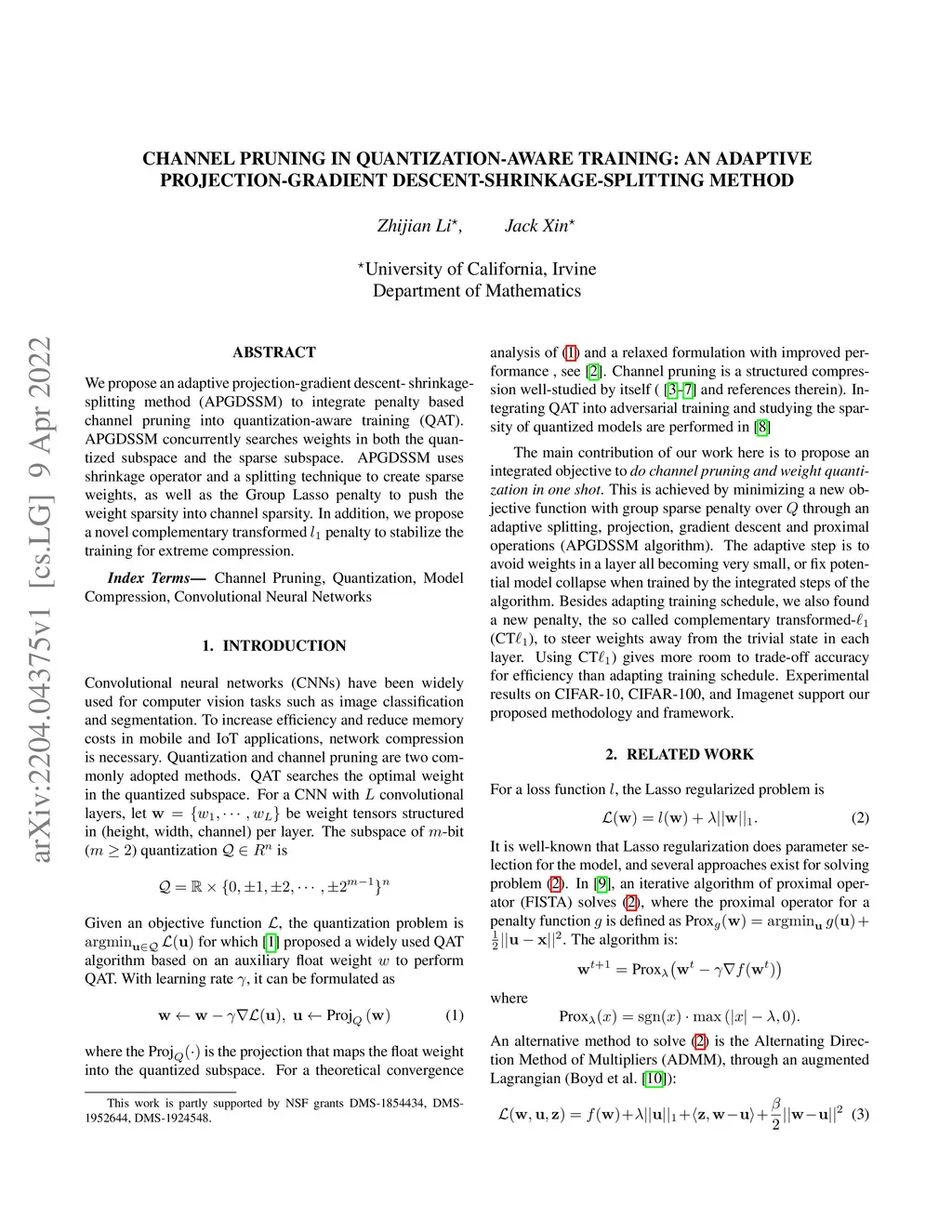 We propose an adaptive projection-gradient descent-shrinkage-splitting method (APGDSSM) to integrate penalty based channel pruning into quantization-aware training (QAT). APGDSSM concurrently searches weights in both the quantized subspace and the sparse subspace. APGDSSM uses shrinkage operator and a splitting technique to create sparse weights, as well as the Group Lasso penalty to push the weight sparsity into channel sparsity. In addition, we propose a novel complementary transformed l1 penalty to stabilize the training for extreme compression.