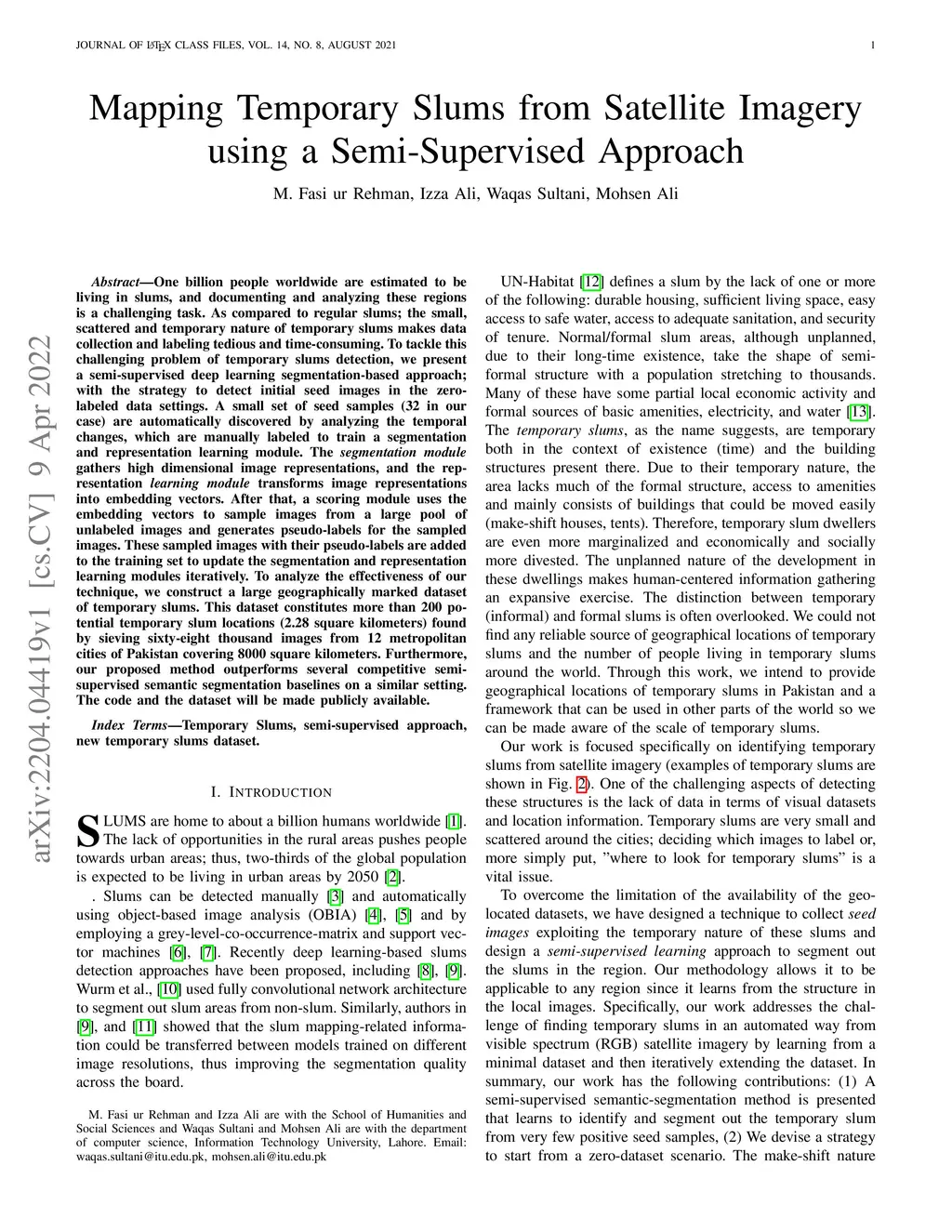One billion people worldwide are estimated to be living in slums, and documenting and analyzing these regions is a challenging task. As compared to regular slums; the small, scattered and temporary nature of temporary slums makes data collection and labeling tedious and time-consuming. To tackle this challenging problem of temporary slums detection, we present a semi-supervised deep learning segmentation-based approach; with the strategy to detect initial seed images in the zero-labeled data settings. A small set of seed samples (32 in our case) are automatically discovered by analyzing the temporal changes, which are manually labeled to train a segmentation and representation learning module. The segmentation module gathers high dimensional image representations, and the representation learning module transforms image representations into embedding vectors. After that, a scoring module uses the embedding vectors to sample images from a large pool of unlabeled images and generates pseudo-labels for the sampled images. These sampled images with their pseudo-labels are added to the training set to update the segmentation and representation learning modules iteratively. To analyze the effectiveness of our technique, we construct a large geographically marked dataset of temporary slums. This dataset constitutes more than 200 potential temporary slum locations (2.28 square kilometers) found by sieving sixty-eight thousand images from 12 metropolitan cities of Pakistan covering 8000 square kilometers. Furthermore, our proposed method outperforms several competitive semi-supervised semantic segmentation baselines on a similar setting. The code and the dataset will be made publicly available.