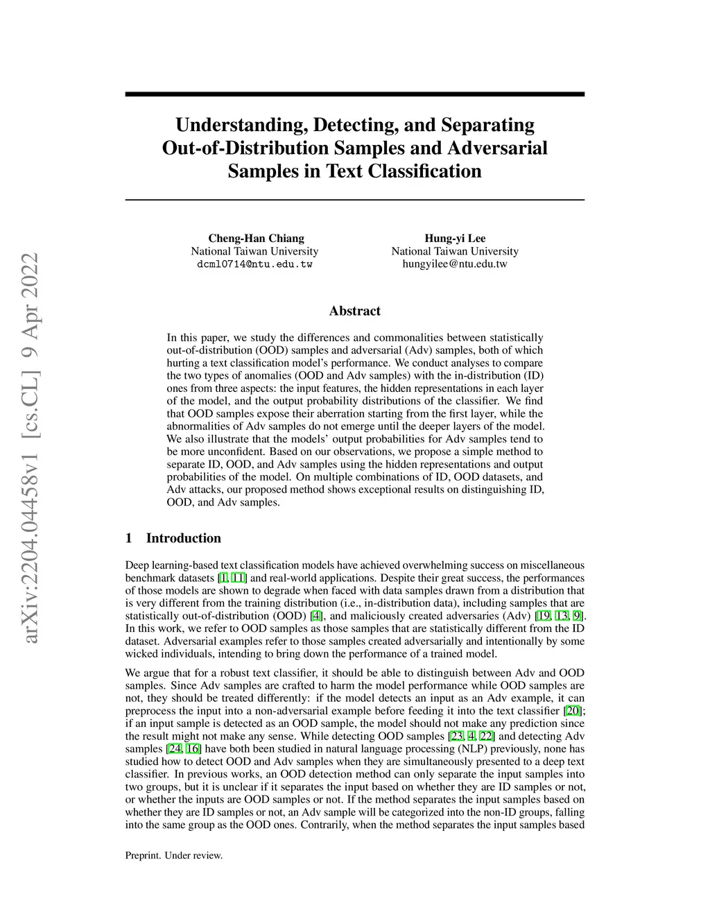 In this paper, we study the differences and commonalities between statistically out-of-distribution (OOD) samples and adversarial (Adv) samples, both of which hurting a text classification model's performance. We conduct analyses to compare the two types of anomalies (OOD and Adv samples) with the in-distribution (ID) ones from three aspects: the input features, the hidden representations in each layer of the model, and the output probability distributions of the classifier. We find that OOD samples expose their aberration starting from the first layer, while the abnormalities of Adv samples do not emerge until the deeper layers of the model. We also illustrate that the models' output probabilities for Adv samples tend to be more unconfident. Based on our observations, we propose a simple method to separate ID, OOD, and Adv samples using the hidden representations and output probabilities of the model. On multiple combinations of ID, OOD datasets, and Adv attacks, our proposed method shows exceptional results on distinguishing ID, OOD, and Adv samples.