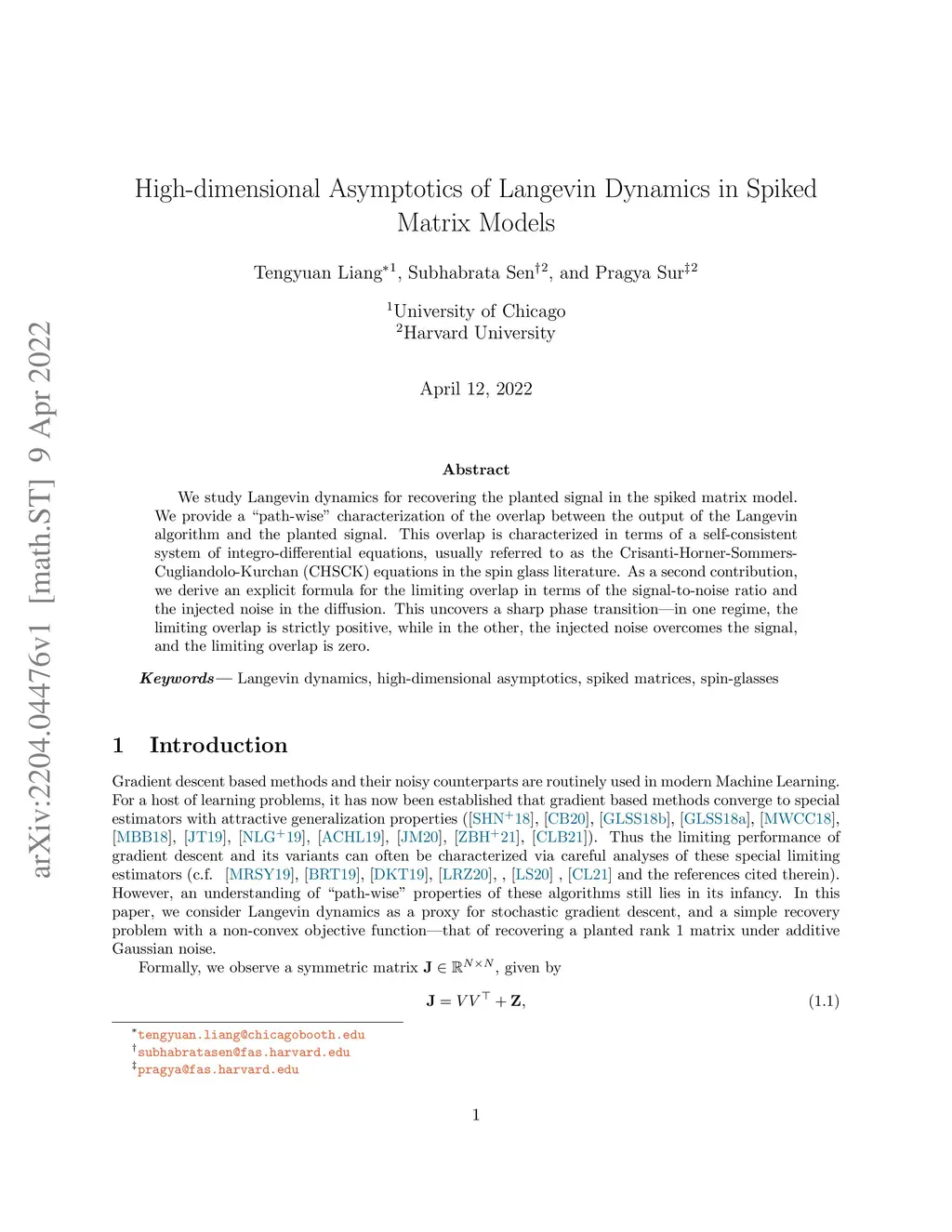 We study Langevin dynamics for recovering the planted signal in the spiked matrix model. We provide a "path-wise" characterization of the overlap between the output of the Langevin algorithm and the planted signal. This overlap is characterized in terms of a self-consistent system of integro-differential equations, usually referred to as the Crisanti-Horner-Sommers-Cugliandolo-Kurchan (CHSCK) equations in the spin glass literature. As a second contribution, we derive an explicit formula for the limiting overlap in terms of the signal-to-noise ratio and the injected noise in the diffusion. This uncovers a sharp phase transition -- in one regime, the limiting overlap is strictly positive, while in the other, the injected noise overcomes the signal, and the limiting overlap is zero.