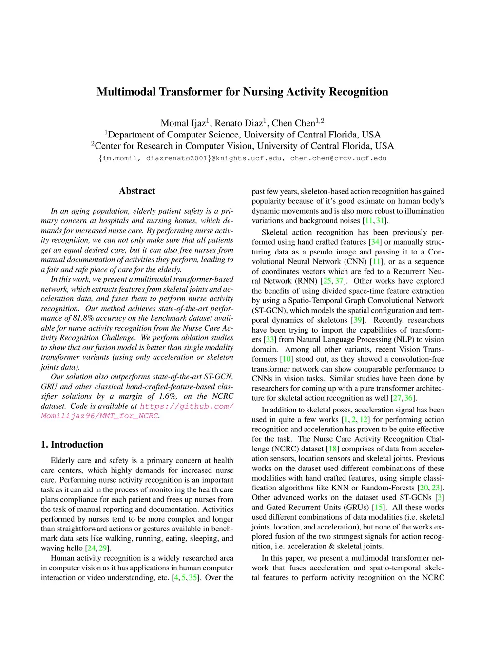 Multimodal Transformer for Nursing Activity Recognition