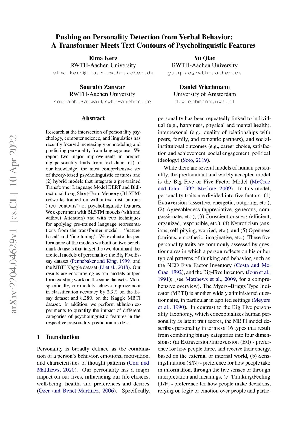 Pushing on Personality Detection from Verbal Behavior: A Transformer