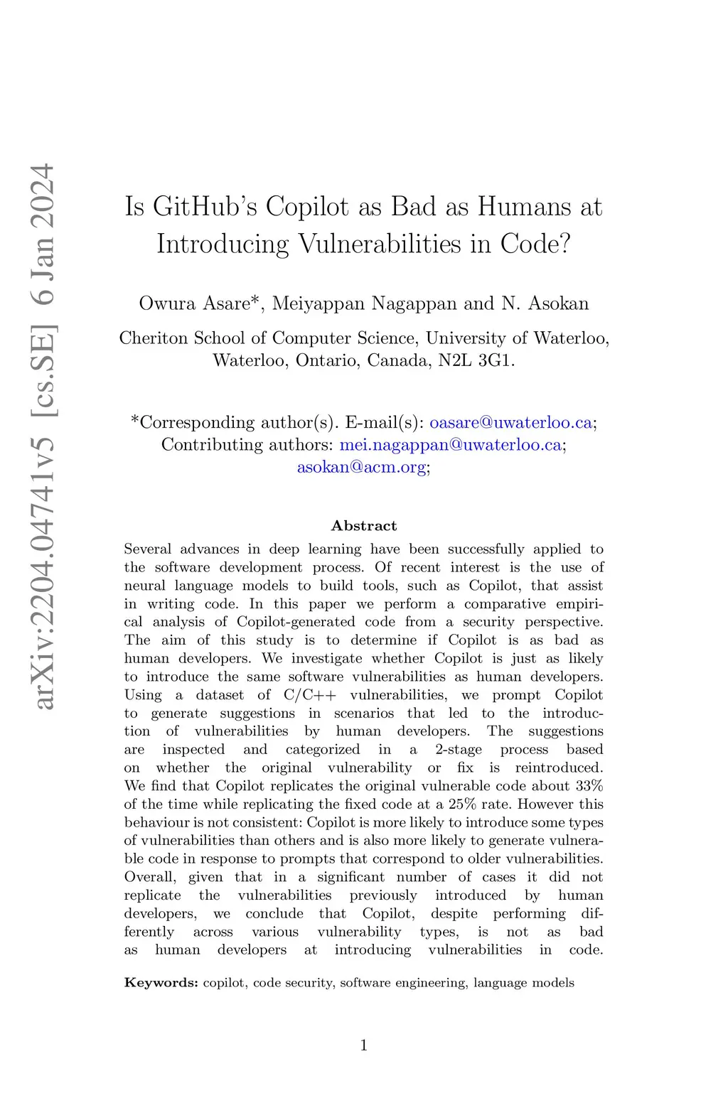 Several advances in deep learning have been successfully applied to the software development process. Of recent interest is the use of neural language models to build tools, such as Copilot, that assist in writing code. In this paper we perform a comparative empirical analysis of Copilot-generated code from a security perspective. The aim of this study is to determine if Copilot is as bad as human developers. We investigate whether Copilot is just as likely to introduce the same software vulnerabilities as human developers. Using a dataset of C/C++ vulnerabilities, we prompt Copilot to generate suggestions in scenarios that led to the introduction of vulnerabilities by human developers. The suggestions are inspected and categorized in a 2-stage process based on whether the original vulnerability or fix is reintroduced. We find that Copilot replicates the original vulnerable code about 33% of the time while replicating the fixed code at a 25% rate. However this behaviour is not consistent: Copilot is more likely to introduce some types of vulnerabilities than others and is also more likely to generate vulnerable code in response to prompts that correspond to older vulnerabilities. Overall, given that in a significant number of cases it did not replicate the vulnerabilities previously introduced by human developers, we conclude that Copilot, despite performing differently across various vulnerability types, is not as bad as human developers at introducing vulnerabilities in code.