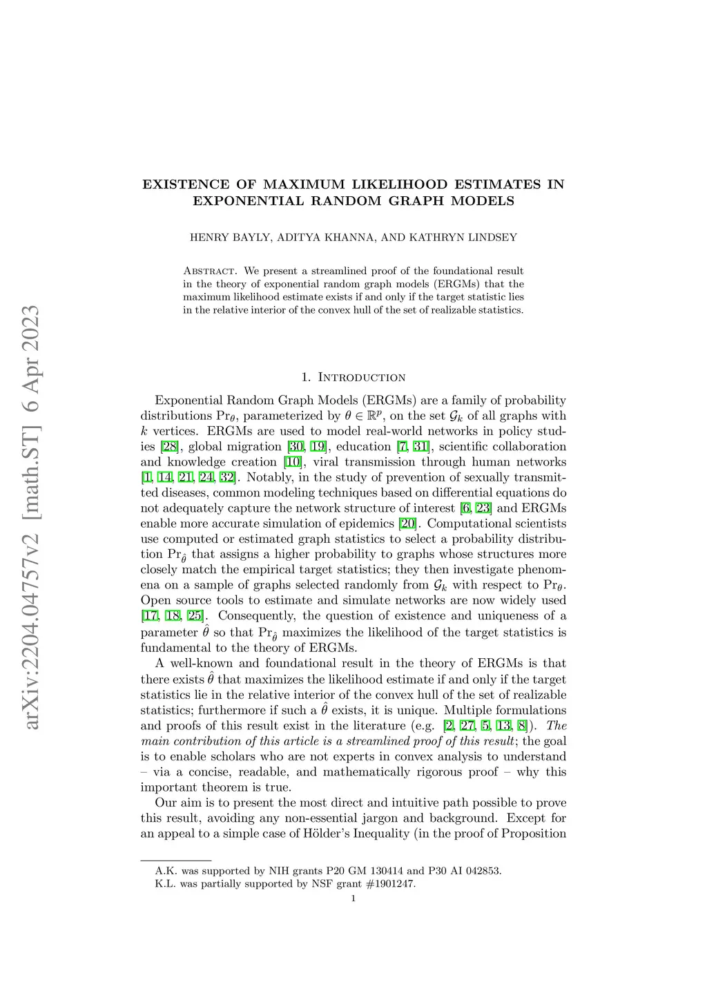 We present a streamlined proof of the foundational result in the theory of exponential random graph models (ERGMs) that the maximum likelihood estimate exists if and only if the target statistic lies in the relative interior of the convex hull of the set of realizable statistics. .