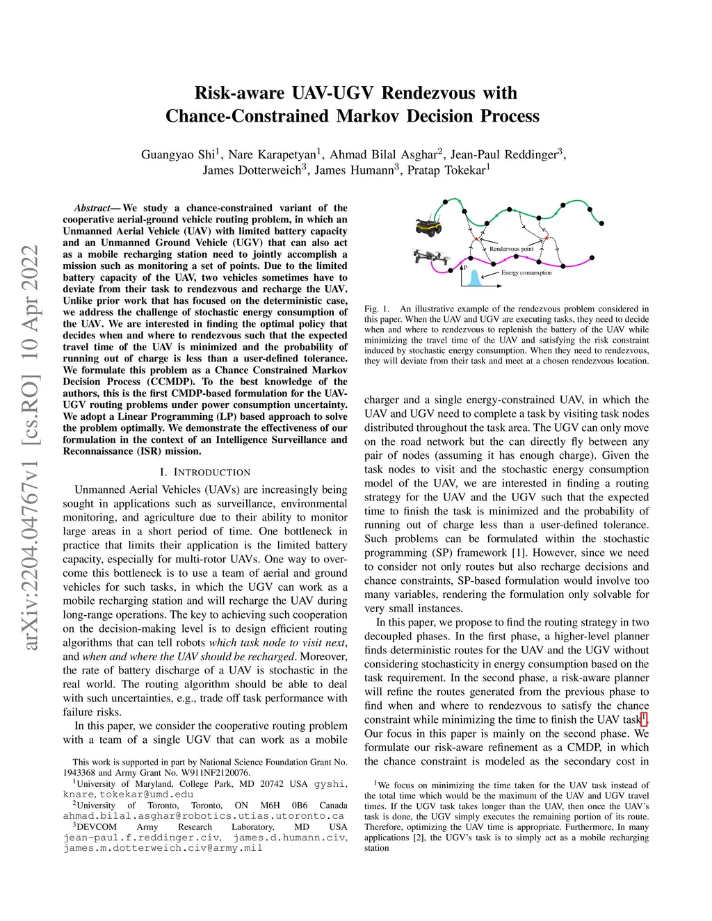 We study a chance-constrained variant of the cooperative aerial-ground vehicle routing problem, in which an Unmanned Aerial Vehicle (UAV) with limited battery capacity and an Unmanned Ground Vehicle (UGV) that can also act as a mobile recharging station need to jointly accomplish a mission such as monitoring a set of points. Due to the limited battery capacity of the UAV, two vehicles sometimes have to deviate from their task to rendezvous and recharge the UAV\@. Unlike prior work that has focused on the deterministic case, we address the challenge of stochastic energy consumption of the UAV\@. We are interested in finding the optimal policy that decides when and where to rendezvous such that the expected travel time of the UAV is minimized and the probability of running out of charge is less than a user-defined tolerance. We formulate this problem as a Chance Constrained Markov Decision Process (CCMDP). To the best knowledge of the authors, this is the first CMDP-based formulation for the UAV-UGV routing problems under power consumption uncertainty. We adopt a Linear Programming (LP) based approach to solve the problem optimally. We demonstrate the effectiveness of our formulation in the context of an Intelligence Surveillance and Reconnaissance (ISR) mission.