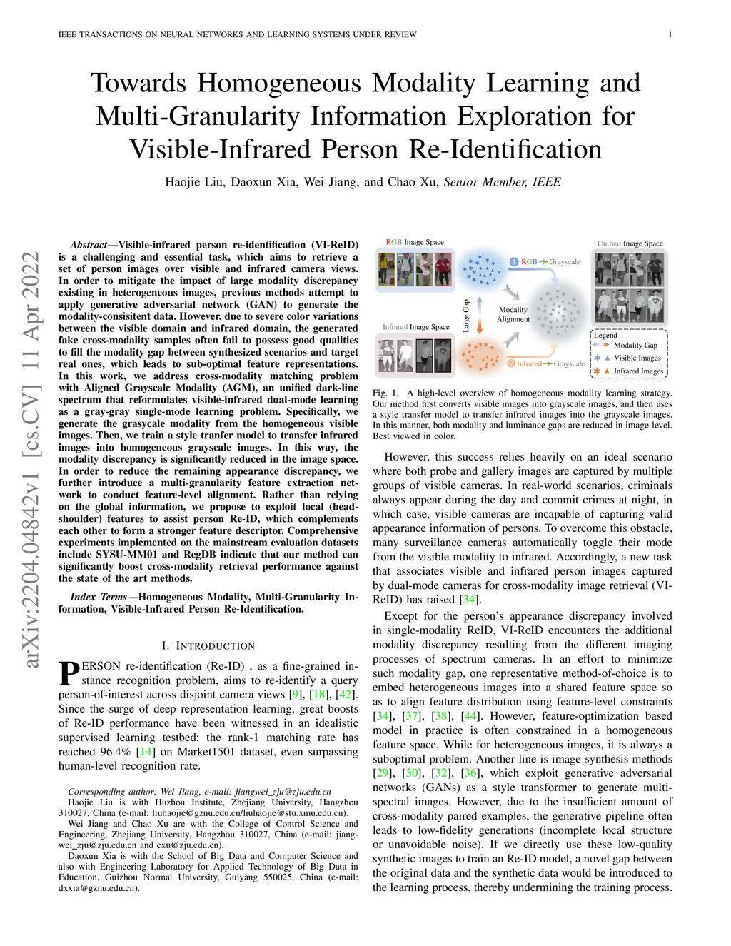 Visible-infrared person re-identification (VI-ReID) is a challenging and essential task, which aims to retrieve a set of person images over visible and infrared camera views. In order to mitigate the impact of large modality discrepancy existing in heterogeneous images, previous methods attempt to apply generative adversarial network (GAN) to generate the modality-consisitent data. However, due to severe color variations between the visible domain and infrared domain, the generated fake cross-modality samples often fail to possess good qualities to fill the modality gap between synthesized scenarios and target real ones, which leads to sub-optimal feature representations. In this work, we address cross-modality matching problem with Aligned Grayscale Modality (AGM), an unified dark-line spectrum that reformulates visible-infrared dual-mode learning as a gray-gray single-mode learning problem. Specifically, we generate the grasycale modality from the homogeneous visible images. Then, we train a style tranfer model to transfer infrared images into homogeneous grayscale images. In this way, the modality discrepancy is significantly reduced in the image space. In order to reduce the remaining appearance discrepancy, we further introduce a multi-granularity feature extraction network to conduct feature-level alignment. Rather than relying on the global information, we propose to exploit local (head-shoulder) features to assist person Re-ID, which complements each other to form a stronger feature descriptor. Comprehensive experiments implemented on the mainstream evaluation datasets include SYSU-MM01 and RegDB indicate that our method can significantly boost cross-modality retrieval performance against the state of the art methods.
