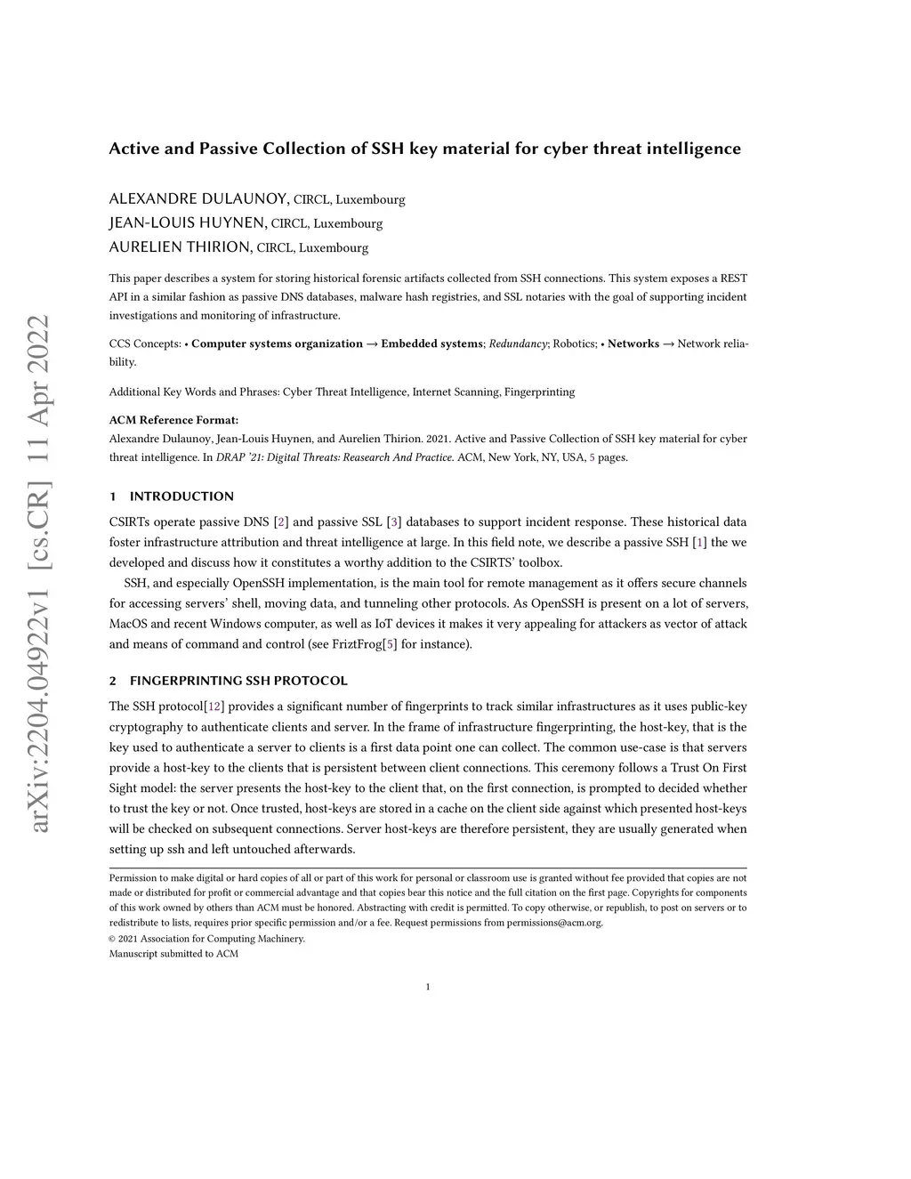 This paper describes a system for storing historical forensic artefacts collected from SSH connections. This system exposes a REST API in a similar fashion as passive DNS databases, malware hash registries, and SSL notaries with the goal of supporting incident investigations and monitoring of infrastructure.