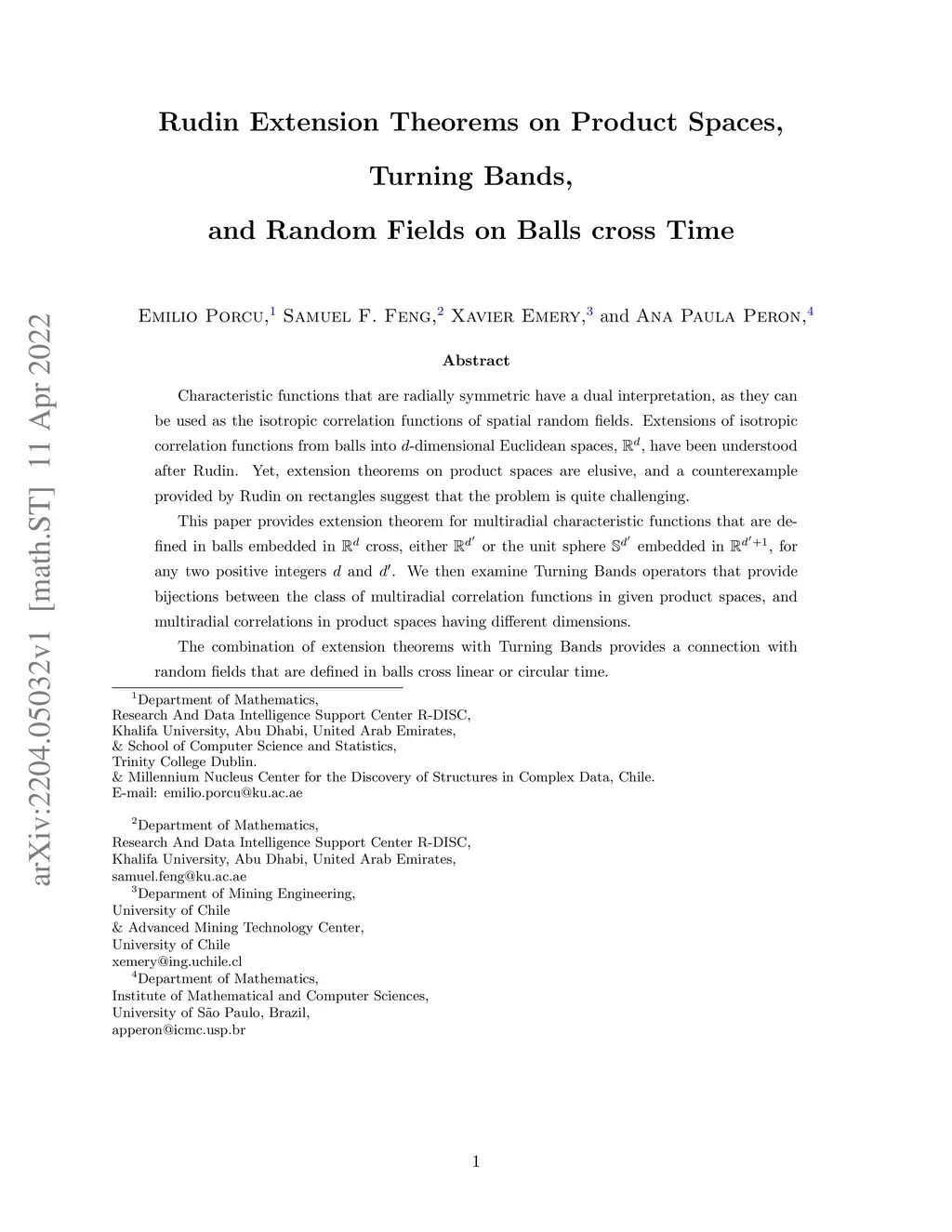 Characteristic functions that are radially symmetric have a dual interpretation, as they can be used as the isotropic correlation functions of spatial random fields. Extensions of isotropic correlation functions from balls into -dimensional Euclidean spaces, , have been understood after Rudin. Yet, extension theorems on product spaces are elusive, and a counterexample provided by Rudin on rectangles suggest that the problem is quite challenging. This paper provides extension theorem for multiradial characteristic functions that are defined in balls embedded in cross, either or the unit sphere embedded in , for any two positive integers and . We then examine Turning Bands operators that provide bijections between the class of multiradial correlation functions in given product spaces, and multiradial correlations in product spaces having different dimensions. The combination of extension theorems with Turning Bands provides a connection with random fields that are defined in balls cross linear or circular time.