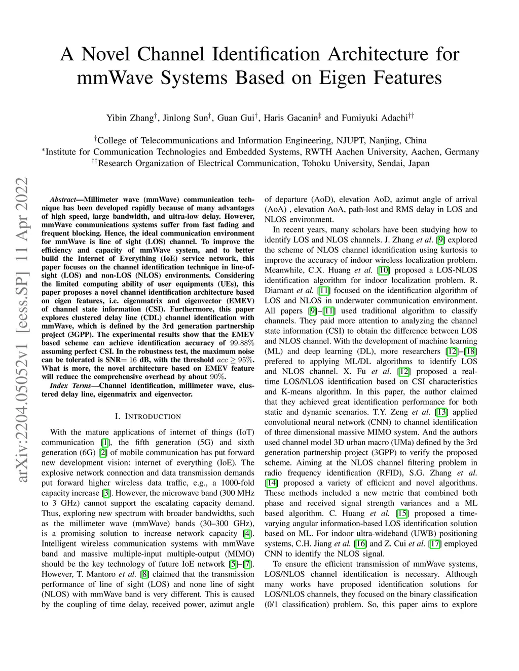 Millimeter wave (mmWave) communication technique has been developed rapidly because of many advantages of high speed, large bandwidth, and ultra-low delay. However, mmWave communications systems suffer from fast fading and frequent blocking. Hence, the ideal communication environment for mmWave is line of sight (LOS) channel. To improve the efficiency and capacity of mmWave system, and to better build the Internet of Everything (IoE) service network, this paper focuses on the channel identification technique in line-of- sight (LOS) and non-LOS (NLOS) environments. Considering the limited computing ability of user equipments (UEs), this paper proposes a novel channel identification architecture based on eigen features, i.e. eigenmatrix and eigenvector (EMEV) of channel state information (CSI). Furthermore, this paper explores clustered delay line (CDL) channel identification with mmWave, which is defined by the 3rd generation partnership project (3GPP). Ther experimental results show that the EMEV based scheme can achieve identification accuracy of 99.88% assuming perfect CSI. In the robustness test, the maximum noise can be tolerated is SNR= 16 dB, with the threshold acc \geq 95%. What is more, the novel architecture based on EMEV feature will reduce the comprehensive overhead by about 90%.