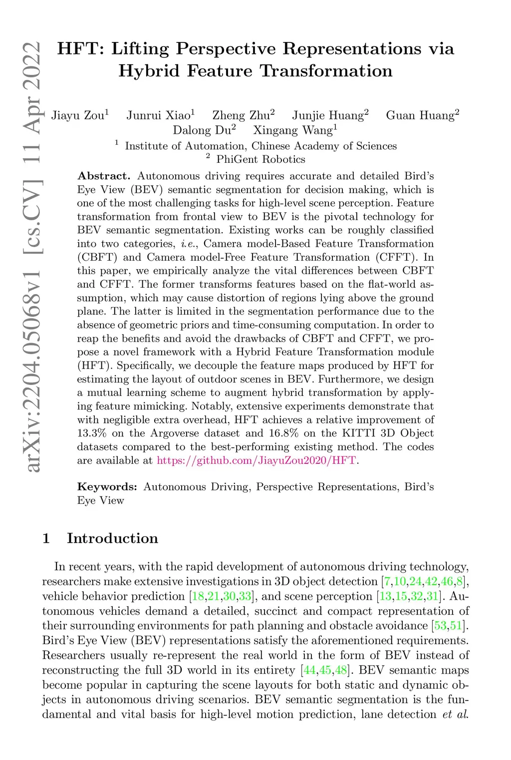 HFT: Lifting Perspective Representations via Hybrid Feature
