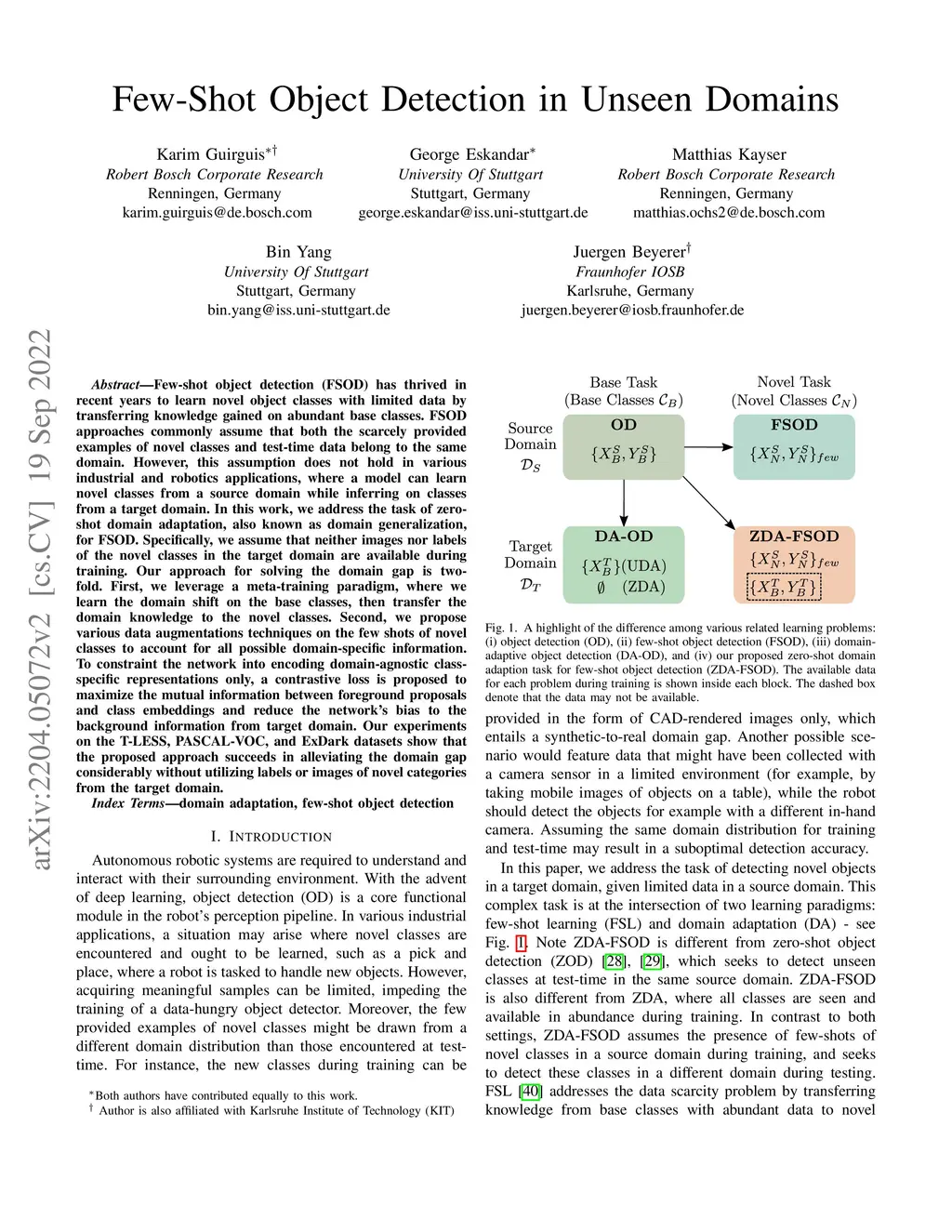 Few-shot object detection (FSOD) has thrived in recent years to learn novel object classes with limited data by transferring knowledge gained on abundant base classes. FSOD approaches commonly assume that both the scarcely provided examples of novel classes and test-time data belong to the same domain. However, this assumption does not hold in various industrial and robotics applications, where a model can learn novel classes from a source domain while inferring on classes from a target domain. In this work, we address the task of zero-shot domain adaptation, also known as domain generalization, for FSOD. Specifically, we assume that neither images nor labels of the novel classes in the target domain are available during training. Our approach for solving the domain gap is two-fold. First, we leverage a meta-training paradigm, where we learn the domain shift on the base classes, then transfer the domain knowledge to the novel classes. Second, we propose various data augmentations techniques on the few shots of novel classes to account for all possible domain-specific information. To constraint the network into encoding domain-agnostic class-specific representations only, a contrastive loss is proposed to maximize the mutual information between foreground proposals and class embeddings and reduce the network's bias to the background information from target domain. Our experiments on the T-LESS, PASCAL-VOC, and ExDark datasets show that the proposed approach succeeds in alleviating the domain gap considerably without utilizing labels or images of novel categories from the target domain.