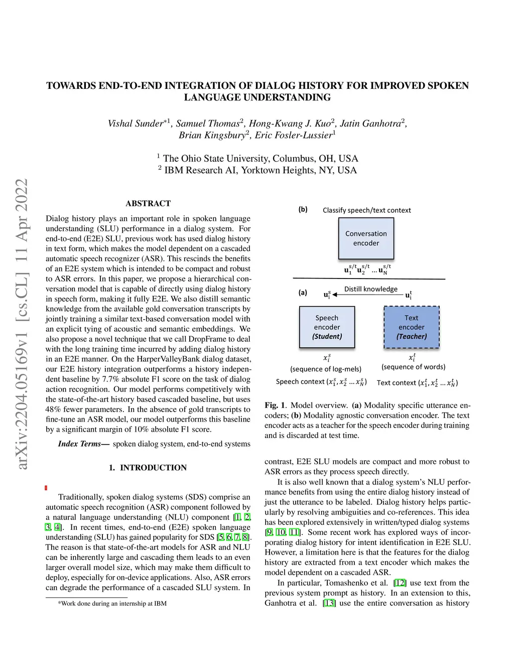 Dialog history plays an important role in spoken language understanding (SLU) performance in a dialog system. For end-to-end (E2E) SLU, previous work has used dialog history in text form, which makes the model dependent on a cascaded automatic speech recognizer (ASR). This rescinds the benefits of an E2E system which is intended to be compact and robust to ASR errors. In this paper, we propose a hierarchical conversation model that is capable of directly using dialog history in speech form, making it fully E2E. We also distill semantic knowledge from the available gold conversation transcripts by jointly training a similar text-based conversation model with an explicit tying of acoustic and semantic embeddings. We also propose a novel technique that we call DropFrame to deal with the long training time incurred by adding dialog history in an E2E manner. On the HarperValleyBank dialog dataset, our E2E history integration outperforms a history independent baseline by 7.7% absolute F1 score on the task of dialog action recognition. Our model performs competitively with the state-of-the-art history based cascaded baseline, but uses 48% fewer parameters. In the absence of gold transcripts to fine-tune an ASR model, our model outperforms this baseline by a significant margin of 10% absolute F1 score.
