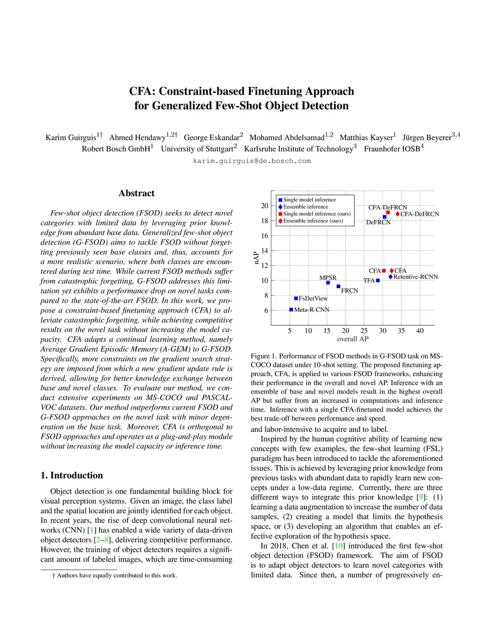 Few-shot object detection (FSOD) seeks to detect novel categories with limited data by leveraging prior knowledge from abundant base data. Generalized few-shot object detection (G-FSOD) aims to tackle FSOD without forgetting previously seen base classes and, thus, accounts for a more realistic scenario, where both classes are encountered during test time. While current FSOD methods suffer from catastrophic forgetting, G-FSOD addresses this limitation yet exhibits a performance drop on novel tasks compared to the state-of-the-art FSOD. In this work, we propose a constraint-based finetuning approach (CFA) to alleviate catastrophic forgetting, while achieving competitive results on the novel task without increasing the model capacity. CFA adapts a continual learning method, namely Average Gradient Episodic Memory (A-GEM) to G-FSOD. Specifically, more constraints on the gradient search strategy are imposed from which a new gradient update rule is derived, allowing for better knowledge exchange between base and novel classes. To evaluate our method, we conduct extensive experiments on MS-COCO and PASCAL-VOC datasets. Our method outperforms current FSOD and G-FSOD approaches on the novel task with minor degeneration on the base task. Moreover, CFA is orthogonal to FSOD approaches and operates as a plug-and-play module without increasing the model capacity or inference time.