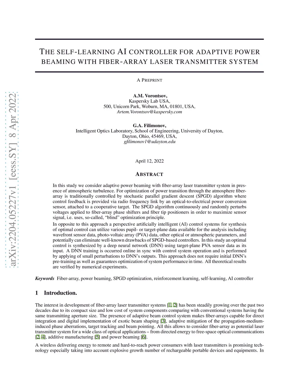In this study we consider adaptive power beaming with fiber-array laser transmitter system in presence of atmospheric turbulence. For optimization of power transition through the atmosphere fiber-array is traditionally controlled by stochastic parallel gradient descent (SPGD) algorithm where control feedback is provided via radio frequency link by an optical-to-electrical power conversion sensor, attached to a cooperative target. The SPGD algorithm continuously and randomly perturbs voltages applied to fiber-array phase shifters and fiber tip positioners in order to maximize sensor signal, i.e. uses, so-called, "blind" optimization principle. In opposite to this approach a perspective artificially intelligent (AI) control systems for synthesis of optimal control can utilize various pupil- or target-plane data available for the analysis including wavefront sensor data, photo-voltaic array (PVA) data, other optical or atmospheric parameters, and potentially can eliminate well-known drawbacks of SPGD-based controllers. In this study an optimal control is synthesized by a deep neural network (DNN) using target-plane PVA sensor data as its input. A DNN training is occurred online in sync with control system operation and is performed by applying of small perturbations to DNN's outputs. This approach does not require initial DNN's pre-training as well as guarantees optimization of system performance in time. All theoretical results are verified by numerical experiments.
