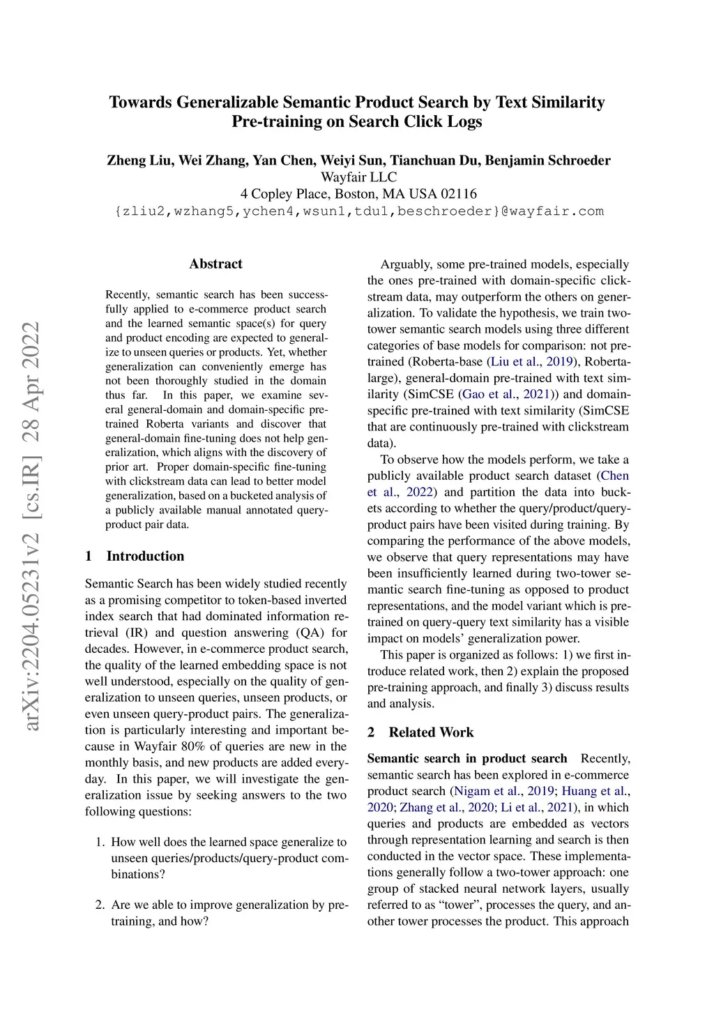 Recently, semantic search has been successfully applied to e-commerce product search and the learned semantic space(s) for query and product encoding are expected to generalize to unseen queries or products. Yet, whether generalization can conveniently emerge has not been thoroughly studied in the domain thus far. In this paper, we examine several general-domain and domain-specific pre-trained Roberta variants and discover that general-domain fine-tuning does not help generalization, which aligns with the discovery of prior art. Proper domain-specific fine-tuning with clickstream data can lead to better model generalization, based on a bucketed analysis of a publicly available manual annotated query-product pair da