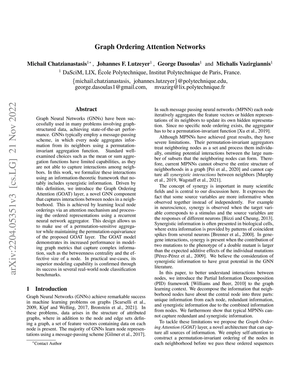 Graph Neural Networks (GNNs) have been successfully used in many problems involving graph-structured data, achieving state-of-the-art performance. GNNs typically employ a message-passing scheme, in which every node aggregates information from its neighbors using a permutation-invariant aggregation function. Standard well-examined choices such as the mean or sum aggregation functions have limited capabilities, as they are not able to capture interactions among neighbors. In this work, we formalize these interactions using an information-theoretic framework that notably includes synergistic information. Driven by this definition, we introduce the Graph Ordering Attention (GOAT) layer, a novel GNN component that captures interactions between nodes in a neighborhood. This is achieved by learning local node orderings via an attention mechanism and processing the ordered representations using a recurrent neural network aggregator. This design allows us to make use of a permutation-sensitive aggregator while maintaining the permutation-equivariance of the proposed GOAT layer. The GOAT model demonstrates its increased performance in modeling graph metrics that capture complex information, such as the betweenness centrality and the effective size of a node. In practical use-cases, its superior modeling capability is confirmed through its success in several real-world node classification benchmarks.