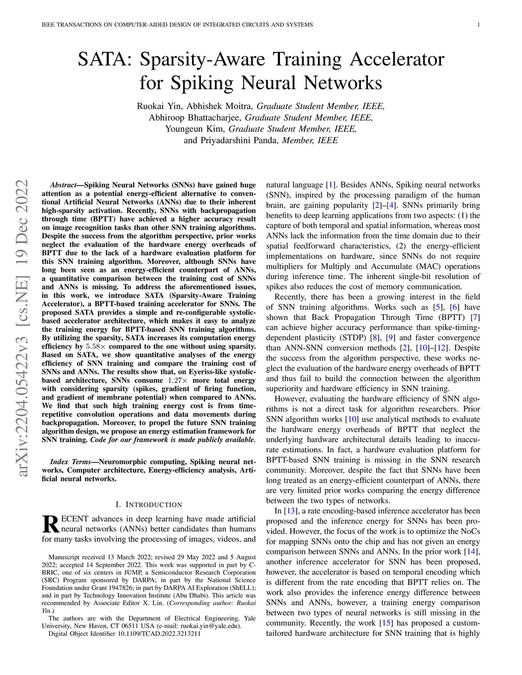 Spiking Neural Networks (SNNs) have gained huge attention as a potential energy-efficient alternative to conventional Artificial Neural Networks (ANNs) due to their inherent high-sparsity activation. Recently, SNNs with backpropagation through time (BPTT) have achieved a higher accuracy result on image recognition tasks than other SNN training algorithms. Despite the success from the algorithm perspective, prior works neglect the evaluation of the hardware energy overheads of BPTT due to the lack of a hardware evaluation platform for this SNN training algorithm. Moreover, although SNNs have long been seen as an energy-efficient counterpart of ANNs, a quantitative comparison between the training cost of SNNs and ANNs is missing. To address the aforementioned issues, in this work, we introduce SATA (Sparsity-Aware Training Accelerator), a BPTT-based training accelerator for SNNs. The proposed SATA provides a simple and re-configurable systolic-based accelerator architecture, which makes it easy to analyze the training energy for BPTT-based SNN training algorithms. By utilizing the sparsity, SATA increases its computation energy efficiency by compared to the one without using sparsity. Based on SATA, we show quantitative analyses of the energy efficiency of SNN training and compare the training cost of SNNs and ANNs. The results show that, on Eyeriss-like systolic-based architecture, SNNs consume more total energy with sparsities when compared to ANNs. We find that such high training energy cost is from time-repetitive convolution operations and data movements during backpropagation. Moreover, to propel the future SNN training algorithm design, we provide several observations on energy efficiency for different SNN-specific training parameters and propose an energy estimation framework for SNN training. Code for our framework is made publicly available.