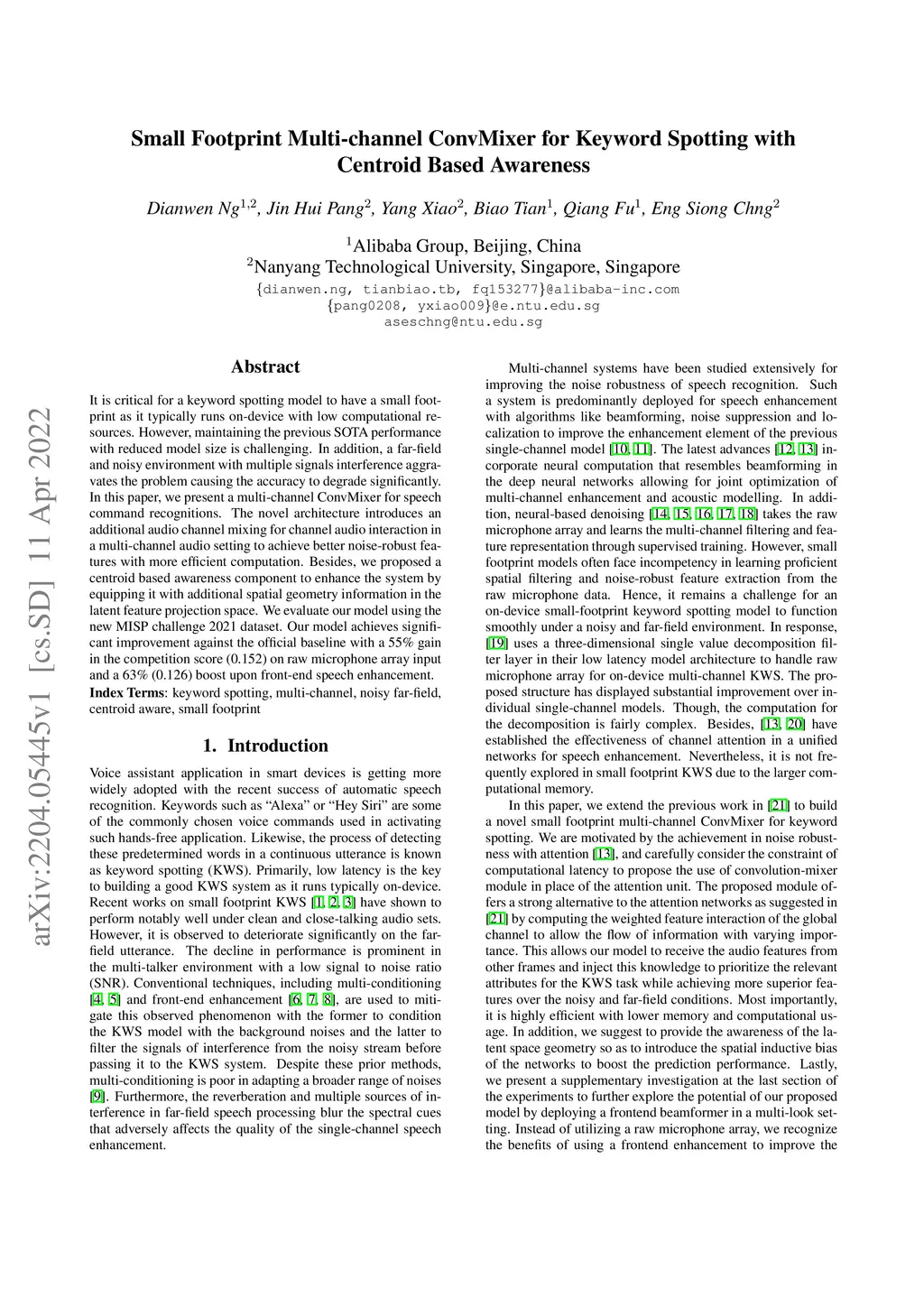 It is critical for a keyword spotting model to have a small footprint as it typically runs on-device with low computational resources. However, maintaining the previous SOTA performance with reduced model size is challenging. In addition, a far-field and noisy environment with multiple signals interference aggravates the problem causing the accuracy to degrade significantly. In this paper, we present a multi-channel ConvMixer for speech command recognitions. The novel architecture introduces an additional audio channel mixing for channel audio interaction in a multi-channel audio setting to achieve better noise-robust features with more efficient computation. Besides, we proposed a centroid based awareness component to enhance the system by equipping it with additional spatial geometry information in the latent feature projection space. We evaluate our model using the new MISP challenge 2021 dataset. Our model achieves significant improvement against the official baseline with a 55% gain in the competition score (0.152) on raw microphone array input and a 63% (0.126) boost upon front-end speech enhancement.