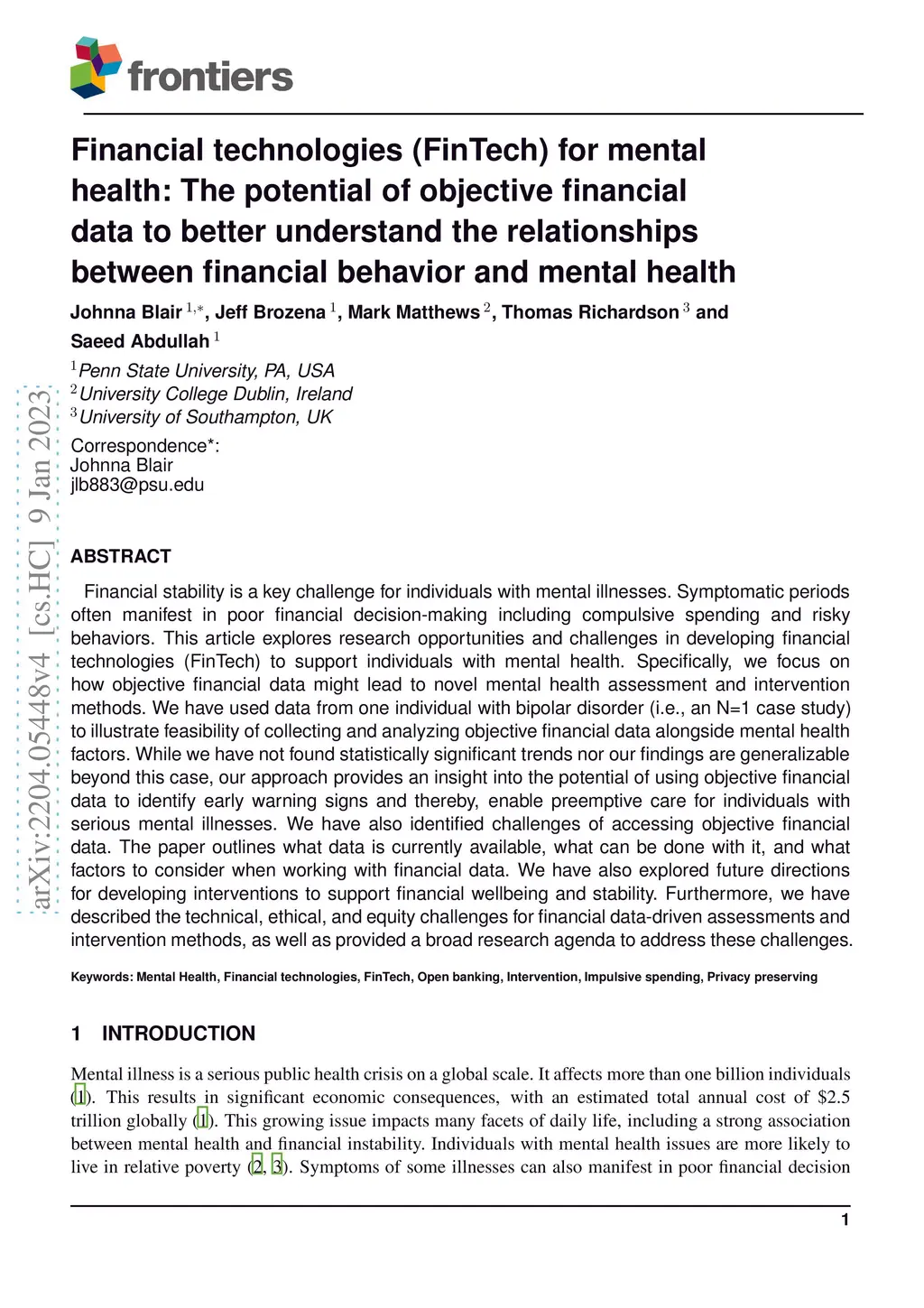 In this paper, we present novel research methods for collecting and analyzing personal financial data alongside mental health factors, illustrated through a N=1 case study using data from one individual with bipolar disorder. While we have not found statistically significant trends nor our findings are generalizable beyond this case, our approach provides an insight into the challenges of accessing objective financial data. We outline what data is currently available, what can be done with it, and what factors to consider when working with financial data. More specifically, using these methods researchers might be able to identify symptomatic traces of mental ill health in personal financial data such as identifying early warning signs and thereby enable preemptive care for individuals with serious mental illnesses. Based on this work, we have also explored future directions for developing interventions to support financial wellbeing. Furthermore, we have described the technical, ethical, and equity challenges for financial data-driven assessments and intervention methods, as well as provided a broad research agenda to address these challenges. By leveraging objective, personalized financial data in a privacy-preserving and ethical manner help lead to a shift in mental health care.