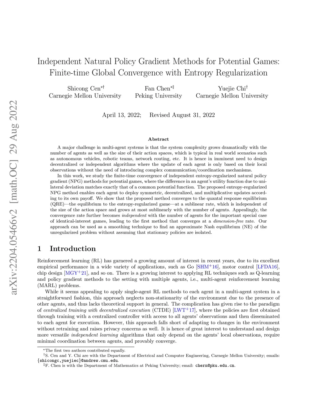 A major challenge in multi-agent systems is that the system complexity grows dramatically with the number of agents as well as the size of their action spaces, which is typical in real world scenarios such as autonomous vehicles, robotic teams, network routing, etc. It is hence in imminent need to design decentralized or independent algorithms where the update of each agent is only based on their local observations without the need of introducing complex communication/coordination mechanisms. In this work, we study the finite-time convergence of independent entropy-regularized natural policy gradient (NPG) methods for potential games, where the difference in an agent's utility function due to unilateral deviation matches exactly that of a common potential function. The proposed entropy-regularized NPG method enables each agent to deploy symmetric, decentralized, and multiplicative updates according to its own payoff. We show that the proposed method converges to the quantal response equilibrium (QRE) -- the equilibrium to the entropy-regularized game -- at a sublinear rate, which is independent of the size of the action space and grows at most sublinearly with the number of agents. Appealingly, the convergence rate further becomes independent with the number of agents for the important special case of identical-interest games, leading to the first method that converges at a dimension-free rate. Our approach can be used as a smoothing technique to find an approximate Nash equilibrium (NE) of the unregularized problem without assuming that stationary policies are isolated.