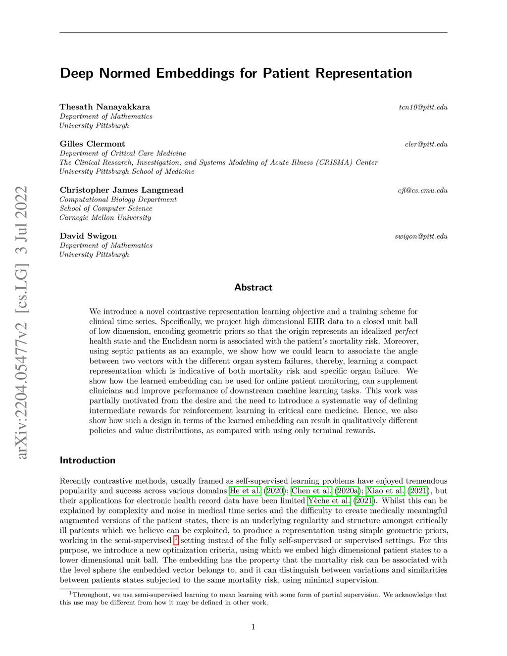 We introduce a novel contrastive representation learning objective and a training scheme for clinical time series. Specifically, we project high dimensional EHR. data to a closed unit ball of low dimension, encoding geometric priors so that the origin represents an idealized perfect health state and the Euclidean norm is associated with the patient's mortality risk. Moreover, using septic patients as an example, we show how we could learn to associate the angle between two vectors with the different organ system failures, thereby, learning a compact representation which is indicative of both mortality risk and specific organ failure. We show how the learned embedding can be used for online patient monitoring, can supplement clinicians and improve performance of downstream machine learning tasks. This work was partially motivated from the desire and the need to introduce a systematic way of defining intermediate rewards for Reinforcement Learning in critical care medicine. Hence, we also show how such a design in terms of the learned embedding can result in qualitatively different policies and value distributions, as compared with using only terminal rewards.